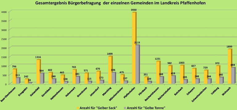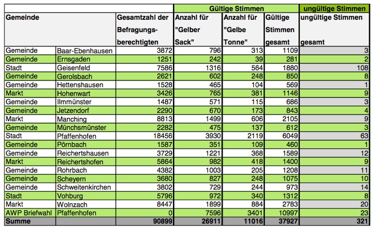 (ty) Die Bürger im Landkreis Pfaffenhofen wollen auch weiterhin ihren Recycling-Abfall eigenhändig in gelben Säcken zum Wertstoffhof bringen – und sie wollen keine gelbe Tonne, die ein Mal im Monat vor ihrem Haus geleert wird. Das geht unmissverständlich aus der heutigen Bürgerbefragung hervor, die landkreisweit parallel zur Europawahl abgehalten wurde. Zwar wird erst am morgigen Montag das endgültige Ergebnis feststehen, doch an diesem grundsätzlichen Bild wird sich so gut wie sicher nichts Entscheidendes mehr ändern.