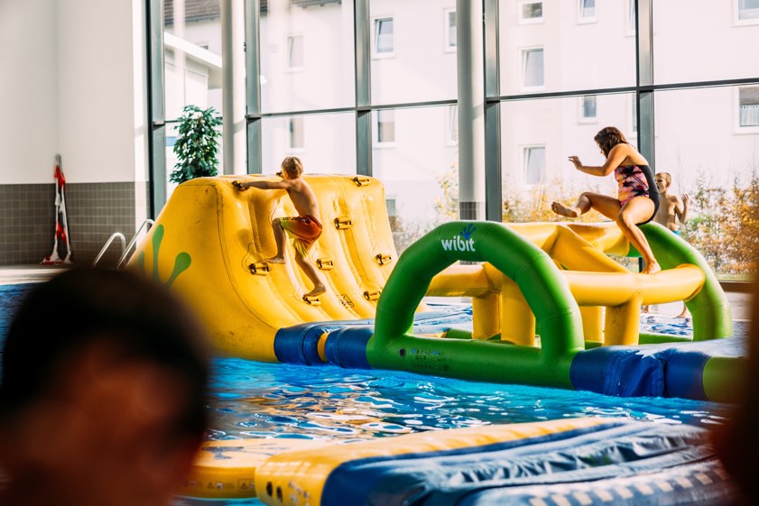 Auf dem Aqua-Track, einem modular aufgebauten Hindernis-Parcours, finden laut Bäder-Gesellschaft an diesem Nachmittag etliche Geschicklichkeits-Rennen in verschiedenen Altersgruppen statt. Eine weitere Besonderheit bei diesem Event sei das so genannte Aqua-Fun. "Bei diesem Animations-Programm kann zu fetziger Musik synchron getanzt und gesungen werden", erklärt die Bäder-GmbH. Gute Laune verspreche ein Animations-Team der Event- und Kommunikations-Agentur "H2O fun Events", die auch alle Wasserspiel-Geräte stelle. Das Schwimmer-Becken sei an diesem Samstag im genannten Zeitraum für den normalen Betrieb gesperrt.