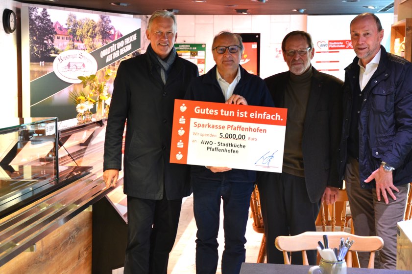 (ty) Mit einer stattlichen Spende an die Arbeiterwohlfahrt (AWO) in Pfaffenhofen unterstützt die Stiftung der hiesigen Sparkasse die Stadtküche im Zentrum der Kreisstadt. Marktdirektor Michael Hoyer und Marktbereichs-Leiter Bernd Schäfer überbrachten im Namen des Geldinstituts den symbolischen Scheck über 5000 Euro und übergaben diesen an Walter Regensburger und Volker Hoppe vom AWO-Ortsverband (Foto oben).