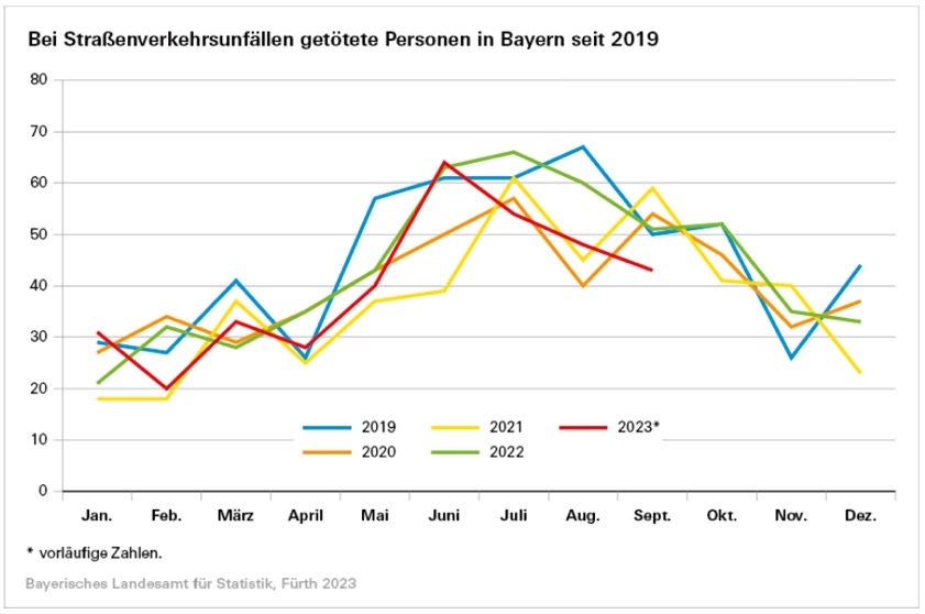 In den ersten neun Monaten des laufenden Jahres erhöhte sich die Anzahl der Unfälle in Bayern um 1,9 Prozent auf insgesamt 283 738. Mit 47 156 Verunglückten insgesamt wurden aber 2,2 Prozent weniger Menschen im Straßenverkehr getötet oder verletzt als im Vorjahres-Zeitraum.