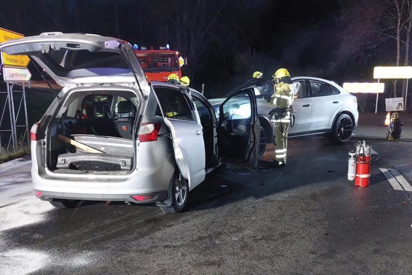 Porsche und Ford kollidierten auf der Staatsstraße 2233 zwischen Kelheim und Ihrlerstein. Beide Pkw-Lenker sowie 17-jähriger Mitfahrer verletzt.