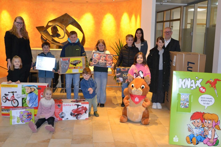 Stellvertretend für sämtliche Gewinnerinnen und Gewinner nahmen in der Kreisstadt nun neun Mädchen und Buben ihre Preise in Empfang (Foto oben). Marktbereichs-Leiter Florian Anthofer begrüßte die Sprösslinge sowie deren Eltern und blickte noch einmal kurz auf die Spartage. Dann wurden die Kinder aber nicht länger auf die Folter gespannt. Die beiden Jugendmarkt-Betreuerinnen Katharina Wolf und Jasmin Stiller überreichten ihnen ihre Geschenke. Nach und nach finden die weiteren Preisübergaben in anderen Sparkassen-Filialen im Landkreis statt. Verteilt werden Bobby-Cars, Roller, Laufräder, Riesen-Plüschtiere, Sitzsäcke, Spiele-Sammlungen, Zauberkästen, Bluetooth-Lautsprecher, Hüpf-Pferde und Tischkicker.