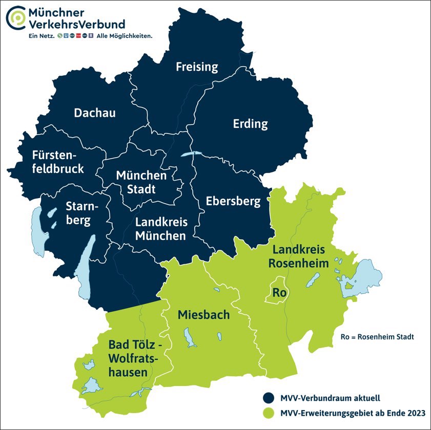 (ty) Mit dem diesjährigen Fahrplan-Wechsel am heutigen Sonntag, 10. Dezember, wächst das Gebiet des "Münchner Verkehrs- und Tarif-Verbundes" (MVV) deutlich: Mit der größten Erweiterung in der Geschichte des MVV treten die Landkreise Miesbach, Bad Tölz-Wolfratshausen (südlicher Teil) und Rosenheim sowie die kreisfreie Stadt Rosenheim bei. Das bedeutet nach offiziellen Angaben rund 455 000 Einwohner und über 70 Kommunen mehr im MVV-Verbundraum als vorher. Auf weiteren 3000 Quadratkilometern Verbund-Gebiet kommen über 1500 Haltestellen und etwa 100 Buslinien hinzu. Die öffentlichen Verkehrsmittel zu nutzen wird hier fahrgastfreundlicher durch einen gemeinsamen Tarif. Gab es bisher neben der MVV-Tarifzone M sechs weitere Zonen, kommen – ganz einfach gesagt – künftig die Tarifzonen 7 bis 11 hinzu.