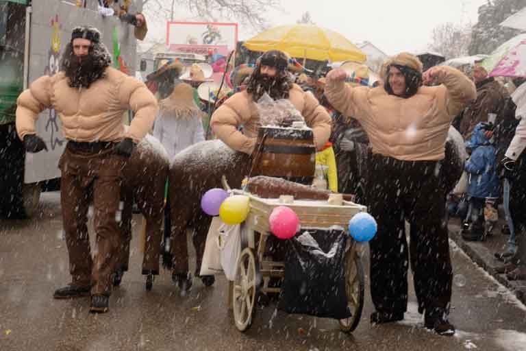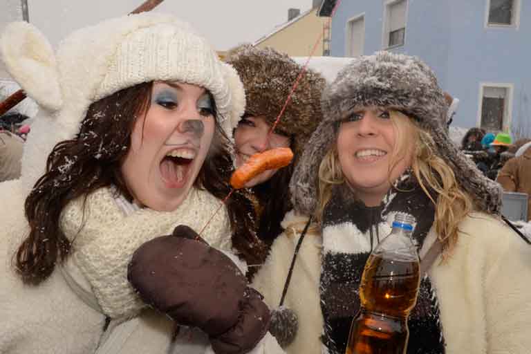 Generell schien die Verkleidungswut in diesem Jahr – vermutlich wetterbedingt - etwas nachgelassen zu haben. Mützen, Schirme und dicke Fellkostüme hatten am Faschingsdienstag in Gerolfing Hochkonjunktur. Da tanzte dann eine Eisbärin mit einem rosa Hasen oder ein Pferd mit einer Tiger-Dame. „Mit dem richtigen Kostüm und dem richtigen Getränk macht das Wetter einem gar nichts mehr aus“, weiß der rosa Hase. Die hübschen „Venezianerinnen“ hatten da mit ihren Kostümen schon größere Probleme. „Es hält nicht besonders warm und der Schnee verfängt sich im Tüllschleier, irgendwann sieht man fast gar nichts mehr. Aber der Gerolfinger Umzug ist einfach Pflicht.“