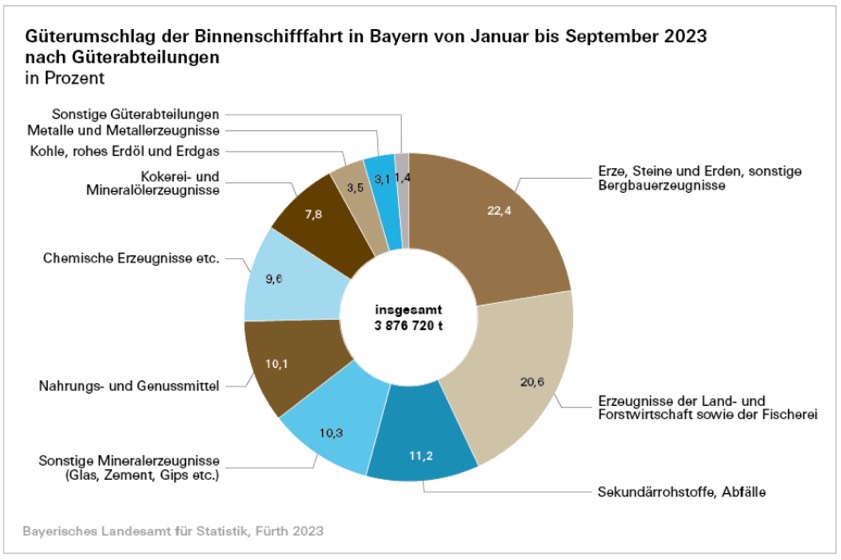 In den Häfen der bayerischen Bundeswasserstraßen wurden heuer von Januar bis September hauptsächlich "Erze, Steine und Erden" (22,4 Prozent) sowie "Erzeugnisse der Land- und Forstwirtschaft" (20,6 Prozent) umgeschlagen. Weitere 11,2 Prozent entfielen auf die Abteilung "Sekundärrohstoffe, Abfälle". In den ersten drei Quartalen dieses Jahres meldeten sich in den Häfen im Freistaat insgesamt 4674 Schiffe mit Umschlagsgütern an und ab, davon befuhren mit 56,7 Prozent mehr als die Hälfte der Schiffe (2648) die Donau.