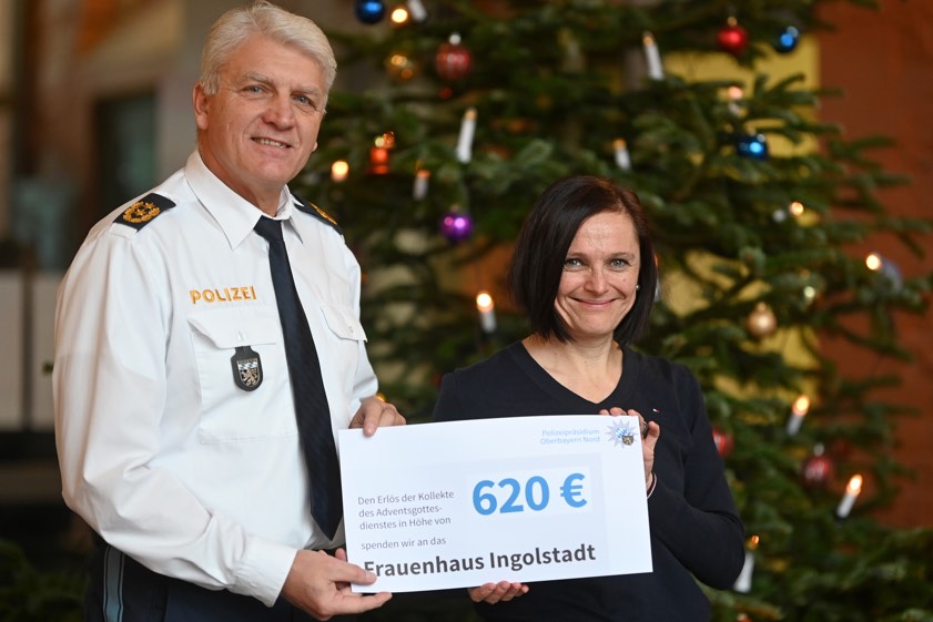 (ty) Das in Ingolstadt ansässige Polizeipräsidium Oberbayern-Nord, hat kürzlich in der Kirche "St. Matthäus" in Ingolstadt seinen traditionellen, ökumenischen Advents-Gottesdienst abgehalten. Durch die Kollekte kam diesmal ein Betrag in Höhe von 620 Euro zusammen. Günther Gietl, der Chef des hiesigen Polizeipräsidiums, überreichte diesen Erlös an Andrea Schlicht, die Leiterin des Caritas-Frauenhauses in Ingolstadt. Sie freute sich sehr über die Finanzspritze und bedankte sich für die Spenden-Bereitschaft der Gottesdienst-Besuchern. Das Frauenhaus ist eine Schutz-Einrichtung für Frauen und Kinder, die von häuslicher Gewalt bedroht werden oder dieser akut ausgesetzt sind.