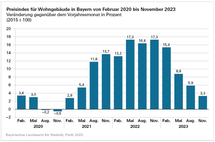 (ty) Gegenüber dem November vergangenen Jahres haben die Preise für den Neubau von Wohngebäuden im Freistaat im November dieses Jahres um durchschnittlich 3,3 Prozent höher gelegen. "Gemessen am Jahr 2022, als Steigerungsraten von über 17 Prozent ermittelt wurden, hat die Preisentwicklung beim Wohnbau somit im Jahresverlauf deutlich an Dynamik verloren", erklärte das bayerische Landesamt für Statistik. Die schwache Konjunktur im Wohnbau mache sich hier immer deutlicher bemerkbar. Mit einem Wert von 159,7 (2015≙100) sei der Preisindex für den Neubau von Wohngebäuden im Vergleich mit dem letzten Erhebungs-Monat (August 2023) nur leicht um 0,3 Prozent angestiegen.