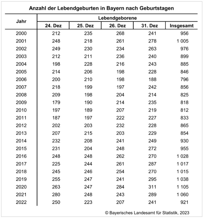 (ty) Unter den insgesamt 124 897 im vergangenen Jahr im Freistaat lebend geborenen Kindern gab es 250 "Christkinder" – 150 Buben und 100 Mädchen. Das wurde aus dem bayerischen Landesamt für Statistik mitgeteilt. Damit belegte der 24. Dezember bei der täglichen Anzahl an Geburten im gesamten vergangenen Jahr Platz 355 von 365. "Die Neugeborenen-Zahlen an Heiligabend, an den beiden Weihnachts-Feiertagen und am letzten Tag des Jahres liegen in der Regel auf niedrigem Niveau relativ nah beieinander", wissen die Experten. Am 25. Dezember vergangenen Jahres waren im Freistaat 223 Kinder geboren worden, am 26. Dezember vergangenen Jahres 207 und am 31. Dezember vergangenen Jahres 241.