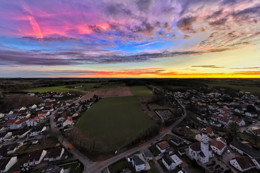 (ty) Und schon geht sie weiter, die Serie von beeindruckenden Fotos aus der Region, die uns unsere Leserinnen und Leser nach wie vor übermitteln. Die Aufnahme, die wir Ihnen am heutigen ersten Weihnachts-Feiertag zeigen können, hat uns Benjamin Uffermann aus dem Gemeinde-Gebiet von Pfaffenhofen zukommen lassen. Entstanden ist sie seinen Worten zufolge am heutigen Nachmittag gegen 16.45 Uhr – und zwar mit Hilfe einer Drohne. Zu sehen ist der Sonnenuntergang über Niederscheyern, der den Himmel in beeindruckende Farben taucht.