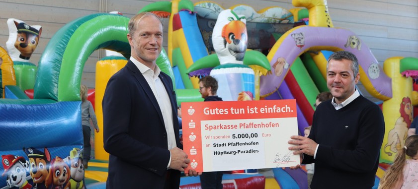 Tino Müller, der Vorstands-Vorsitzende der Pfaffenhofener Sparkasse, überreichte zur Eröffnung einen symbolischen Spenden-Scheck über 5000 Euro an Bürgermeister Thomas Herker (SPD). Das Stadtoberhaupt bedankte sich für diese neuerliche finanzielle Unterstützung. Sein Dank galt auch dem Hüpfburg-Verleiher Norbert Kurzmeier für die fantasievollen Spiel-Elemente. Für die Sprösslinge gibt es viele Möglichkeiten, hier Spaß zu haben. "Neben mehr als zehn Hüpfburgen, darunter Attraktionen wie eine Mähdrescher-Hüpfburg, einigen Riesen-Rutschen und einem aufblasbaren Parcours stehen den Kindern weitere Spiel-Möglichkeiten zur Verfügung", fasst die Stadtverwaltung zusammen: "ein Box-Automat, verschiedene Tretfahrzeuge, ein Bällebad sowie eine Foto-Box."