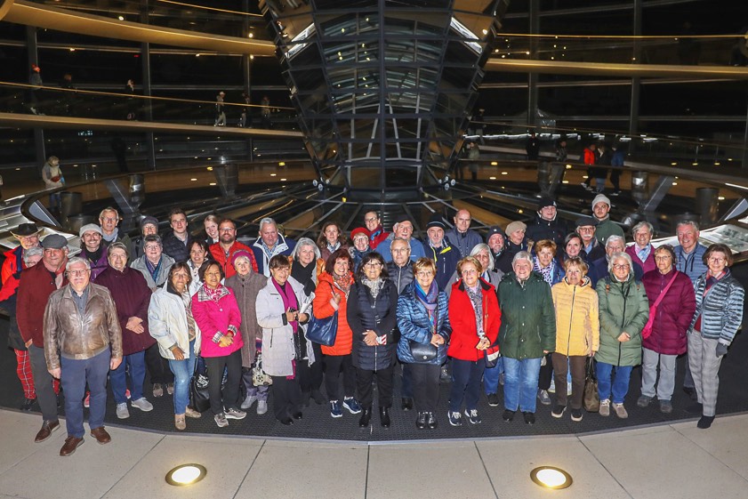 Mehltretter war krank und konnte die Besucher deshalb nicht persönlich im Bundestag empfangen. Stattdessen führte sein Berliner Büro-Leiter das Gespräch, in dem es um Mehltretters Aufgaben und seinen Alltag als Abgeordneter, aber auch um aktuelle politische Fragen ging – zum Beispiel das vom Bundesverfassungsgericht gefällte Urteil zur Schuldenbremse. Informationen über die Geschichte des Reichstags-Gebäudes und die Arbeits-Prozesse im Bundestag erhielten die Gäste bei einem Vortrag auf der Besucher-Tribüne des Plenarsaals. Abschließend genossen sie den Ausblick auf das nächtliche Berlin von der Kuppel des Reichstags-Gebäudes.