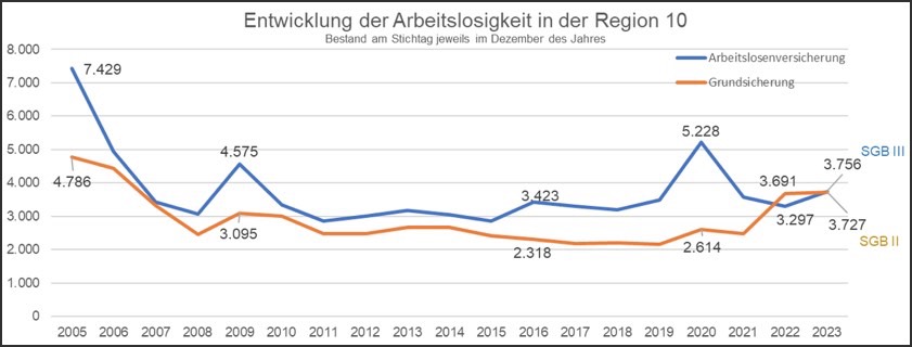 "Mit Blick auf die beiden Rechtskreise – Arbeitslosen-Versicherung und Grundsicherung – ist festzuhalten, dass nach dem 2022 vor allem durch die Kriegs-Flüchtlinge aus der Ukraine bedingten Anstieg der Arbeitslosigkeit im Berichtsjahr 2023 die Zahl der von den Job-Centern in der Region betreuten arbeitslosen Personen relativ konstant war", heißt es in der Rückschau. Während in der Grundsicherung im Durchschnitt des vergangenen Jahres 3783 Personen arbeitslos gemeldet waren (2022: 3188), seien es im Bereich der Arbeitslosen-Versicherung 3621 gewesen (2022: 3525).