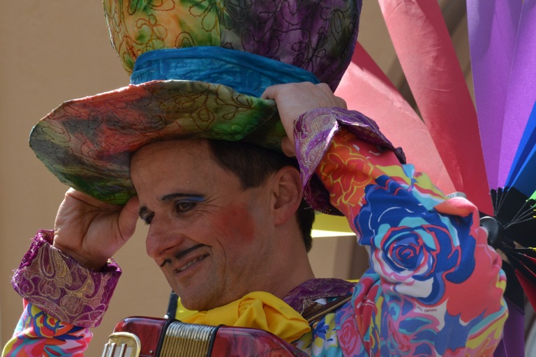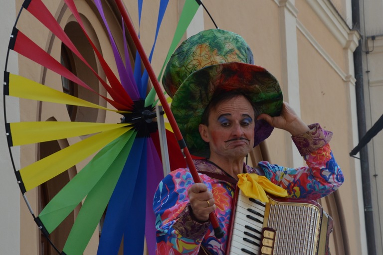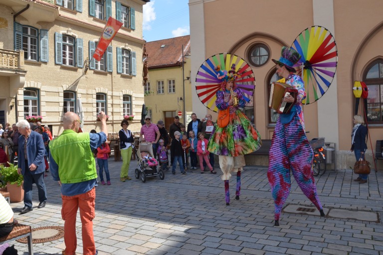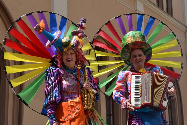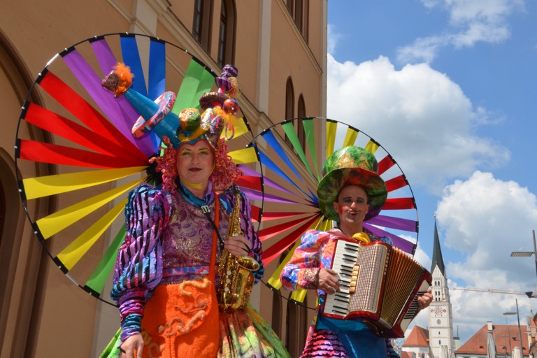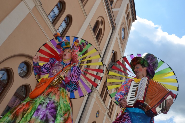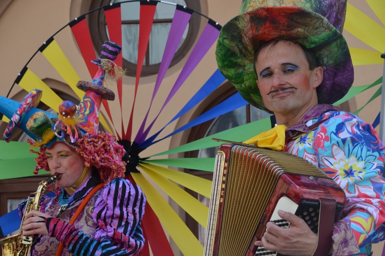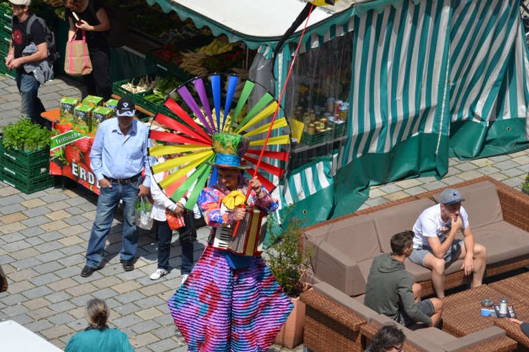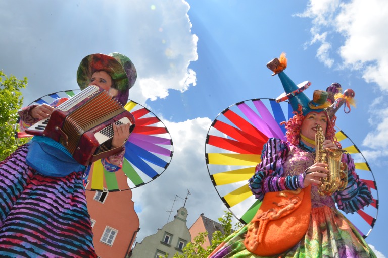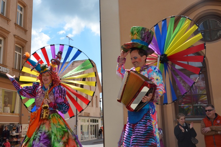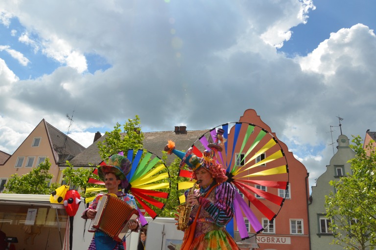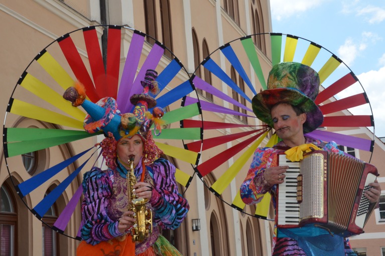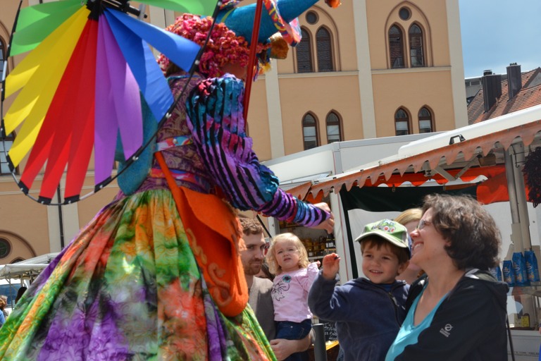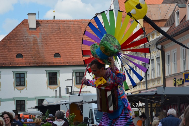 Manch einem war das Artistenehepaar mit seinen extravaganten und auffallenden Kostümen noch in bester Erinnerung. Und auch heuer haben Evelyne und Bernhard Weigl die Besucher des Wochenmarkts wieder mit Farbe, Frohsinn, Musik und toller Unterhaltung verzaubert.