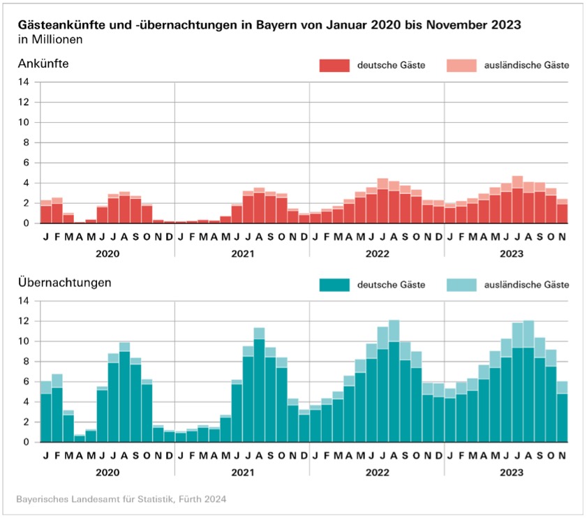 (ty) Für November 2023 hat das bayerische Landesamt für Statistik laut heutiger Mitteilung in den 10 672 geöffneten Beherbergungs-Betrieben im Freistaat rund 2,5 Millionen Gäste-Ankünfte (plus 4,1 Prozent zum Vorjahres-Monat) und fast 6,1 Millionen Übernachtungen (plus 2,5 Prozent zum Vorjahres-Monat) registriert. Dabei erhöhte sich die Zahl der inländischen Gäste um 3,1 Prozent (Übernachtungen: plus 2,0 Prozent) und die der ausländischen Gäste um 8,3 Prozent (Übernachtungen: plus 4,4 Prozent). Von Januar bis November vergangenen Jahres überstiegen sowohl die Gäste-Ankünfte mit gut 36,2 Millionen (plus 13,6 Prozent), als auch die Übernachtungen mit nahezu 93,9 Millionen (plus 8,7 Prozent) die Ergebnisse des Vorjahres-Zeitraums.