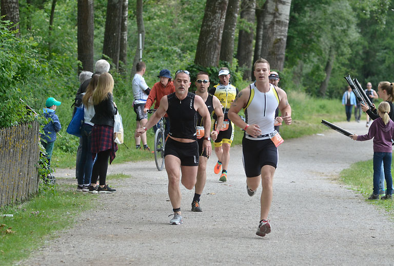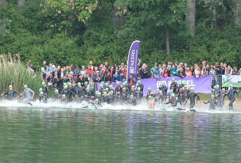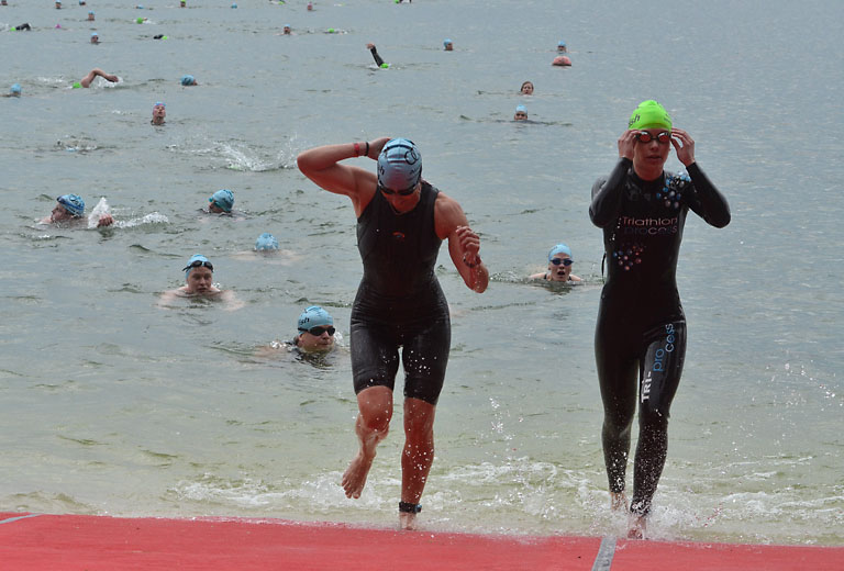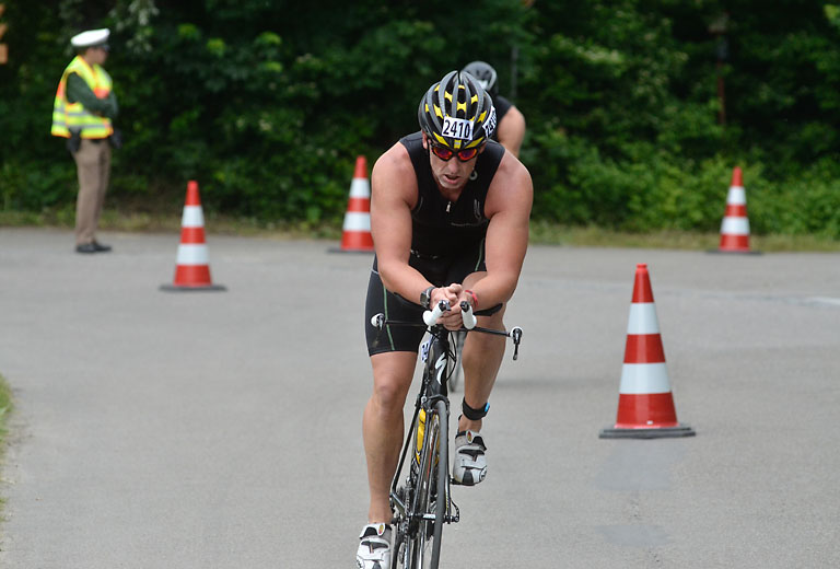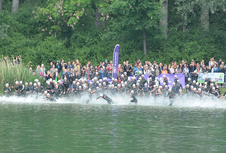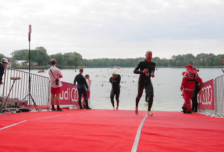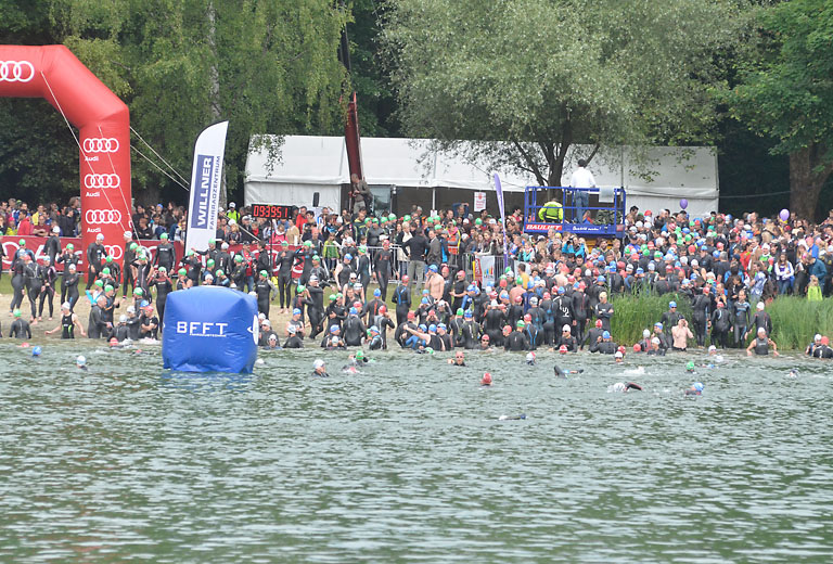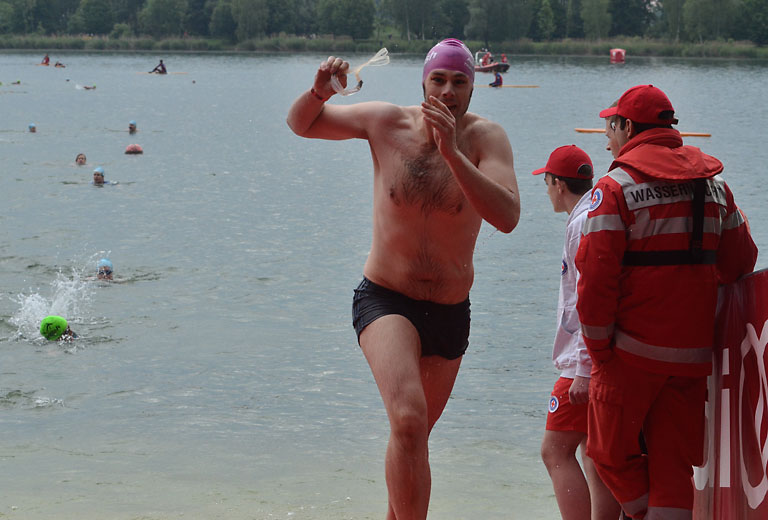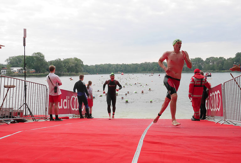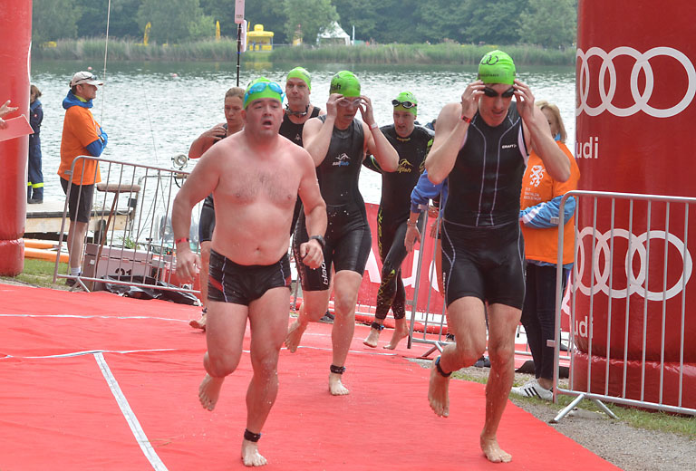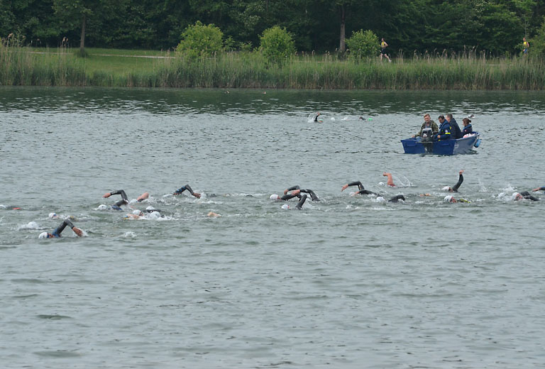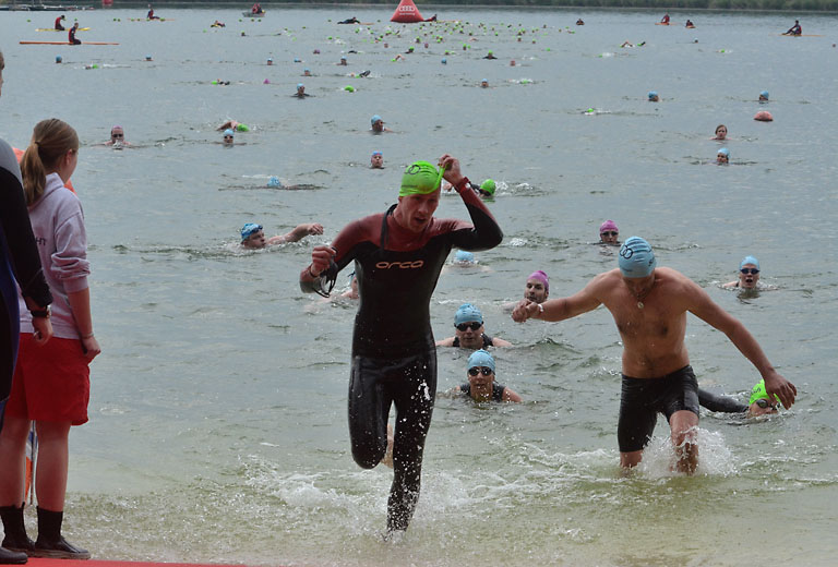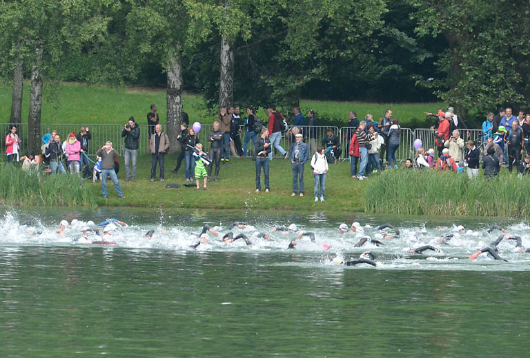 Um 10.25 Uhr ging dann die so genannte Mitteldistanz an den Start, der härteste der drei Wettkampfdisziplinen. Denn während die Shortdistanz mit 0,5 Kilometer Schwimmen, 20 Kilometer Radfahren und fünf Kilometer Laufen noch recht human ist, der Olympischen Distanz über 1,5 Kilometer Schwimmen, 40 Kilometer Radfahren und zehn Kilometer Laufen schon etwas mehr Kondition erfordert, geht es bei der Mitteldistanz ans Eingemachte. Zwei Kilometer Schwimmen, 77 Kilometer Radfahren und 21 Kilometer Laufen.