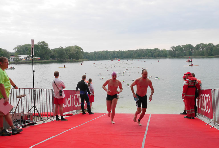 (ty) Zum fünften Mal ging heute früh der Ingolstädter Triathlon über die Bühne. Bei doch recht frischen 17 Grad stürzte sich die erste Gruppe der Short-Distanzler um 6.45 Uhr in den Baggersee. Die meisten hatten sich zwar für den wärmenden Neopren-Anzug entschieden. Aber es gab doch eine ganze Reihe „harter Hunde“, die nur mit der Badehose bewaffnet in die Fluten stiegen.