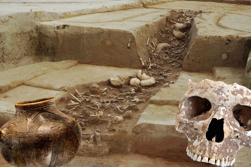 Große Fundkonzentration aus Menschenknochen und Artefakten, kombiniert mit Prunkgefäß und Gesichtsschädel aus der frühneolithischen Grabenanlage von Herxheim.