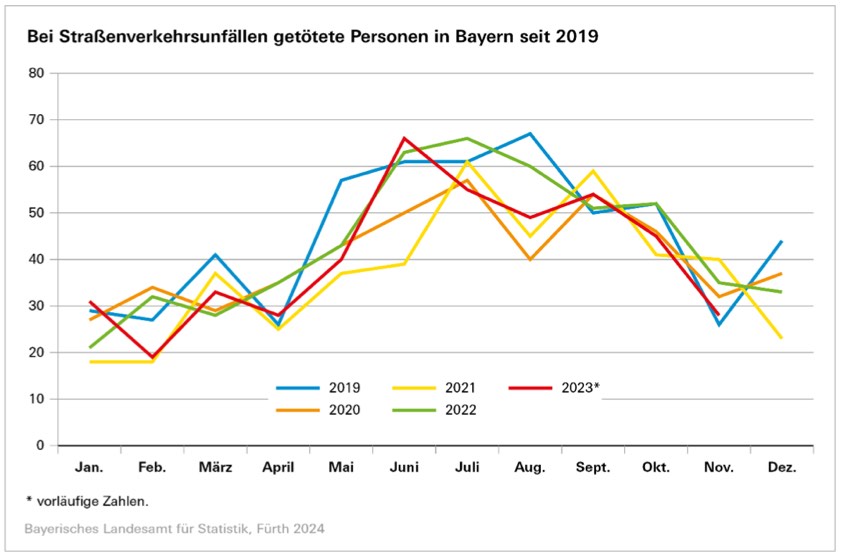 Ebenfalls rückläufig war laut Angaben des Landesamts für Statistik die Zahl der im November 2023 verunglückten Personen: Diese verringerte sich um gut sieben Prozent auf 4075. Die Zahl der Schwerverletzten nahm dabei um 21,1 Prozent ab, die der Leichtverletzten sank um 5,3 Prozent. Auf den bayerischen Straßen kamen im November vergangenen Jahres insgesamt 28 Menschen ums Leben; im Vorjahres-Monat waren es 35 Verkehrstote.
