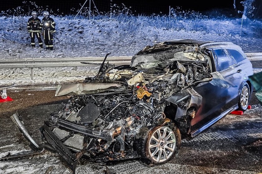46-Jähriger kam am heutigen Morgen mit seinem Pkw von der A8 ab und prallte frontal gegen einen am Beginn eines Parkplatzes stehenden Sattelzug.
