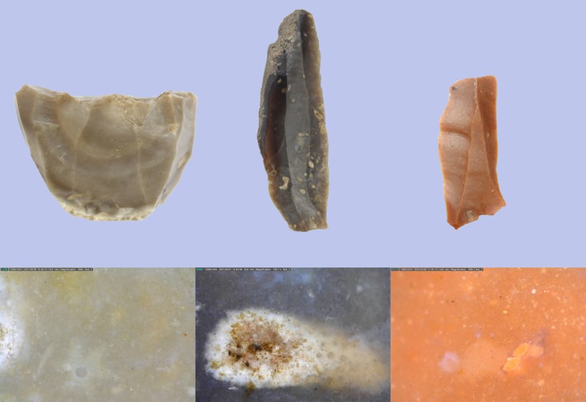Lisa Bauer konnte in ihrer Master-Arbeit die Silex-Artefakte (Feuerstein) aus den Ausgrabungen des Vereins analysieren und anhand von Herkunfts-Analysen überregionale Verbindungen, Kultur-Kontakte und potentielle Mobilitäts-Muster ergründen. "Die Ergebnisse zeichnen ein komplexes System dieser frühbäuerlichen Menschen, das über sesshafte Ackerbauern hinausgeht", heißt es in der Ankündigung. Bauer stellt ihre Arbeit in diesem Vortrag vor. Auf den hier gezeigten Bildern von Lisa Bauer sind Silex-Artefakte aus Niederhummel und Mikrofotos der Rohmaterialien zu sehen.