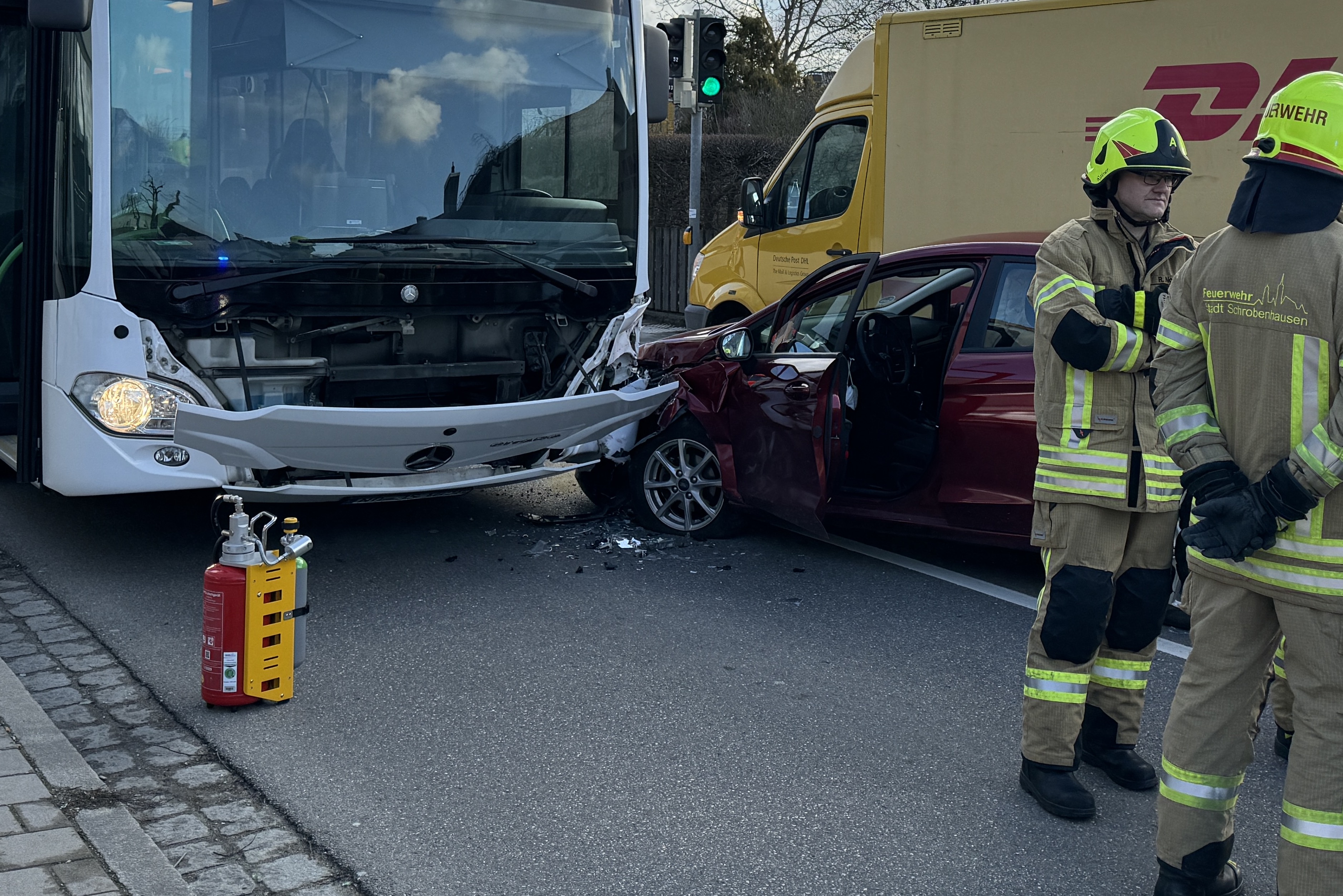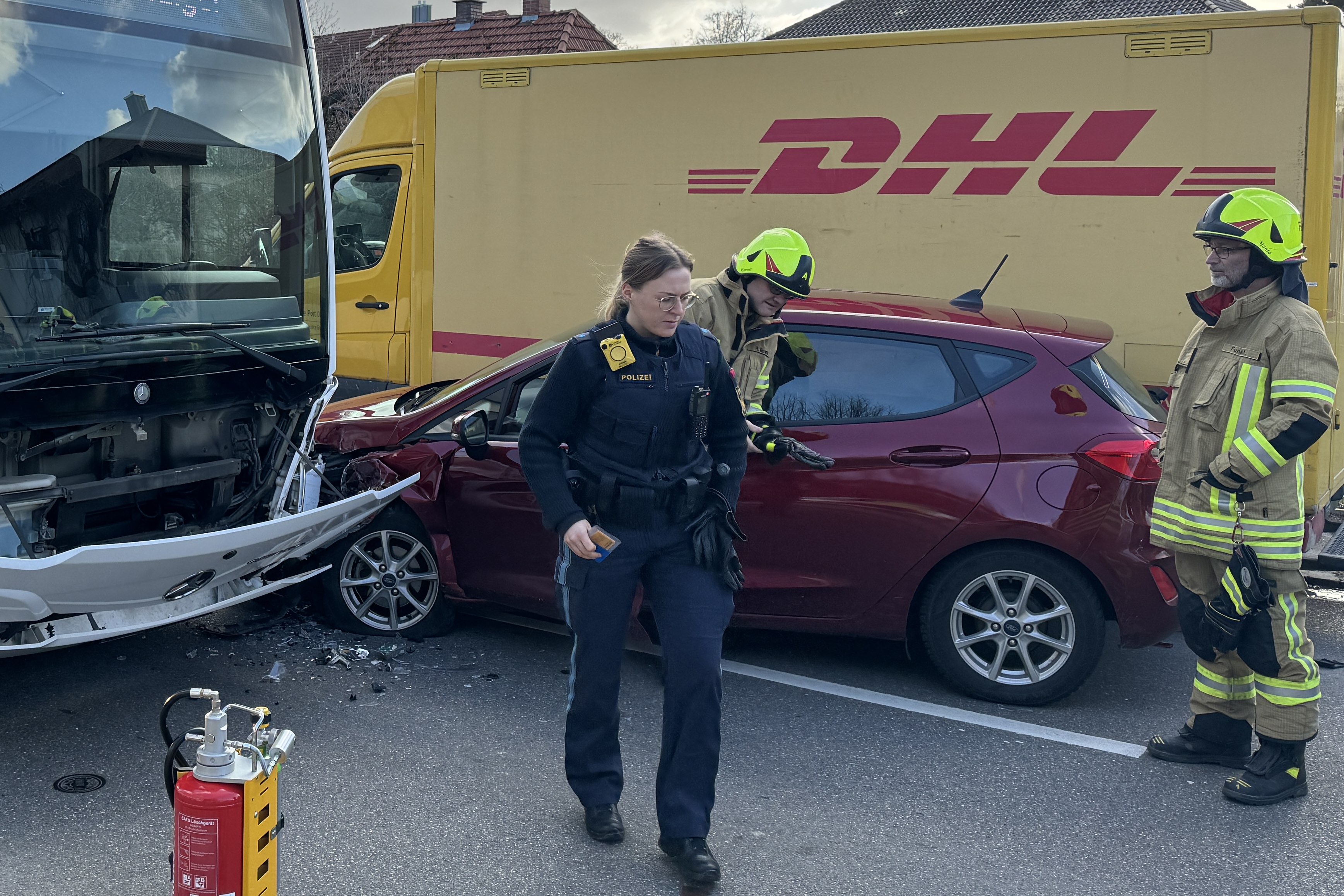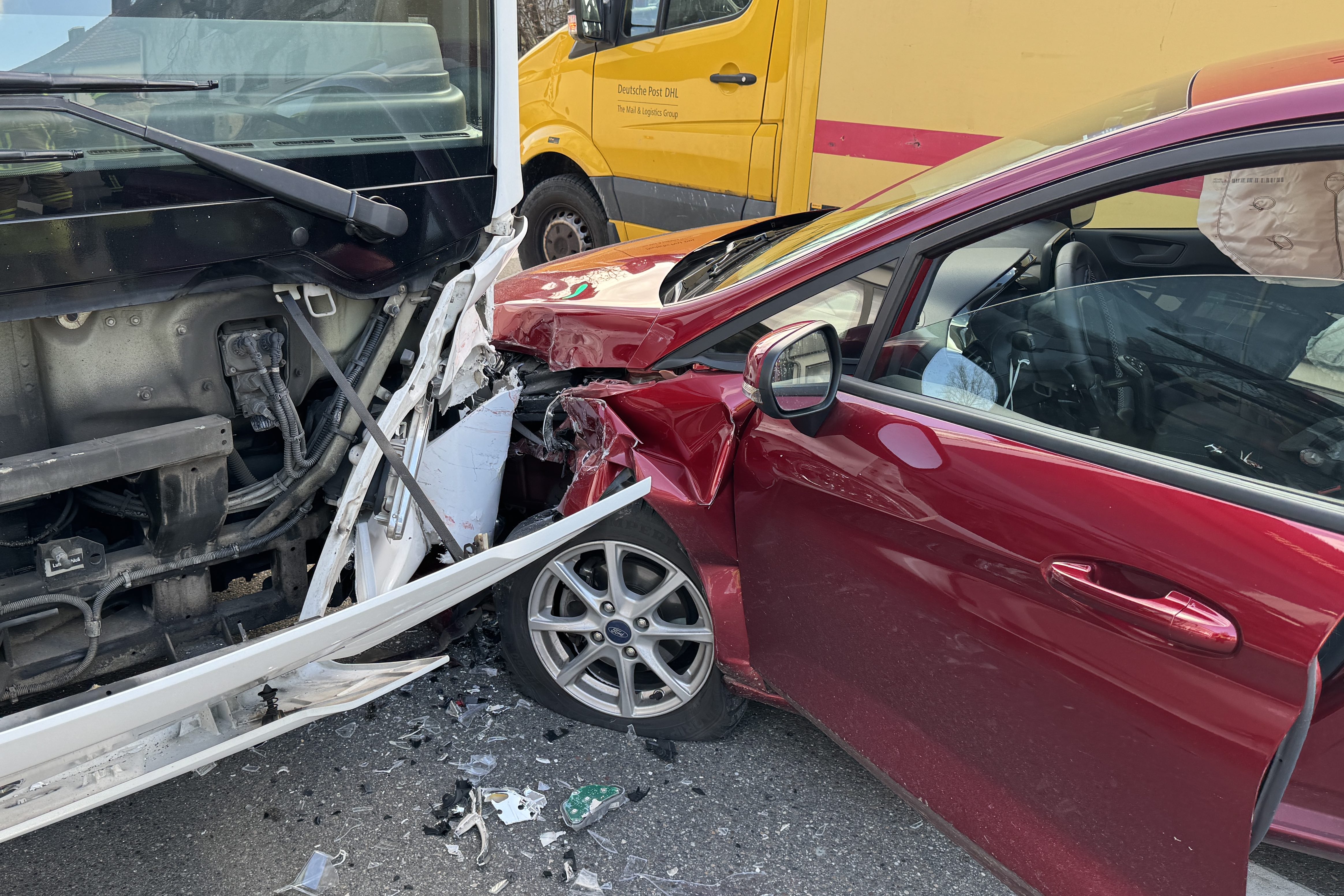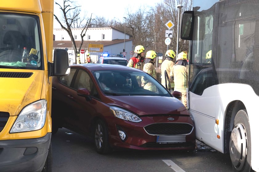 Infolge des Zusammenstoßes mit dem Bus sei der Pkw gegen die linke Seite des Kurier-Wagens gedrückt worden. Der 51-Jährige habe bei der Kollision eine Kopf-Verletzung erlitten. Er sei vom Rettungsdienst in ein Krankenhaus gebracht worden. Den an den drei Fahrzeugen entstandenen Sachschaden bezifferten Streifenbeamte von der örtlichen Polizeiinspektion auf insgesamt etwa 30 000 Euro. Auch die hiesige Feuerwehr war an der Unglücksstelle im Einsatz. Zum Unfall-Zeitpunkt befand sich laut Polizei nur der Fahrer selbst in dem Omnibus.