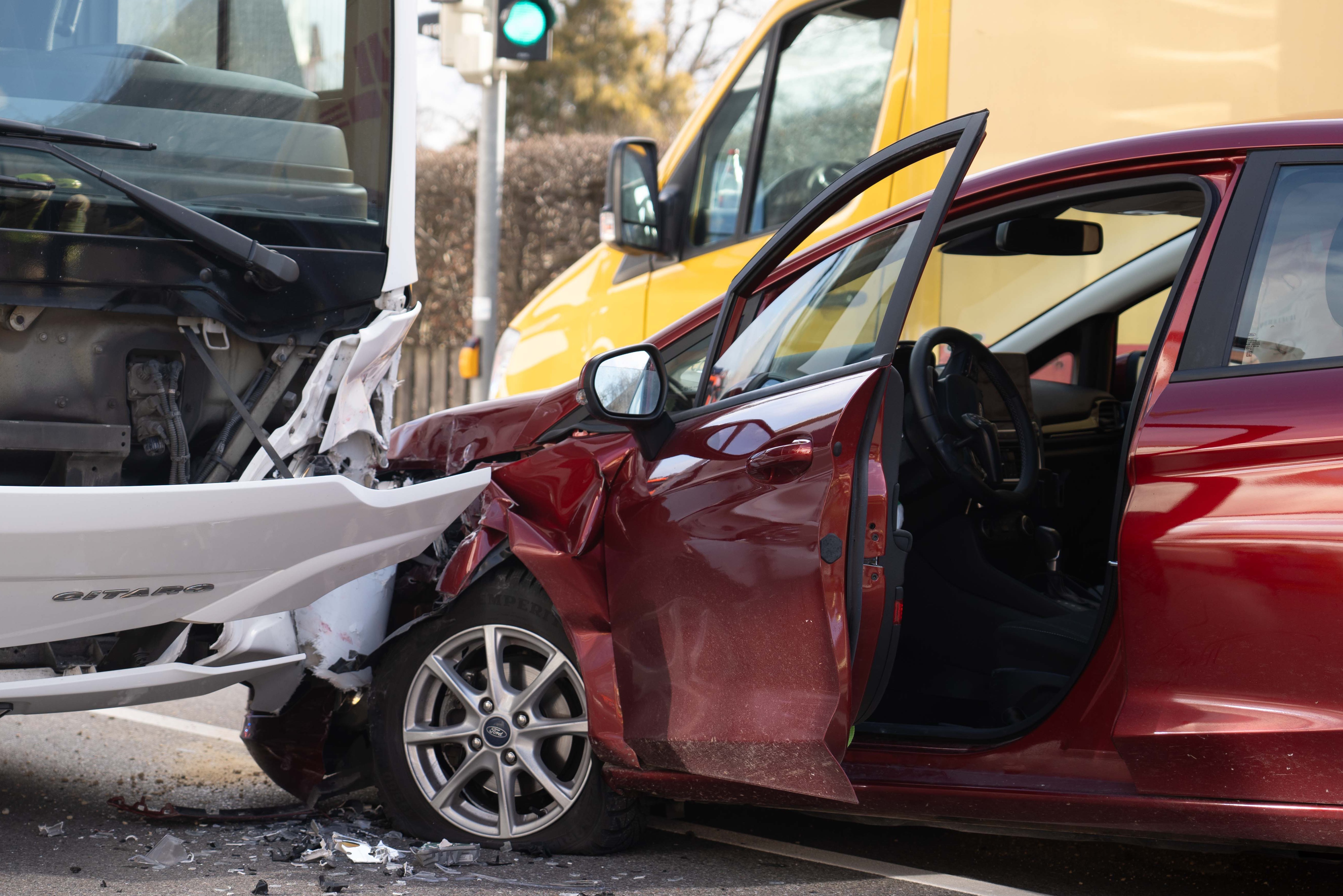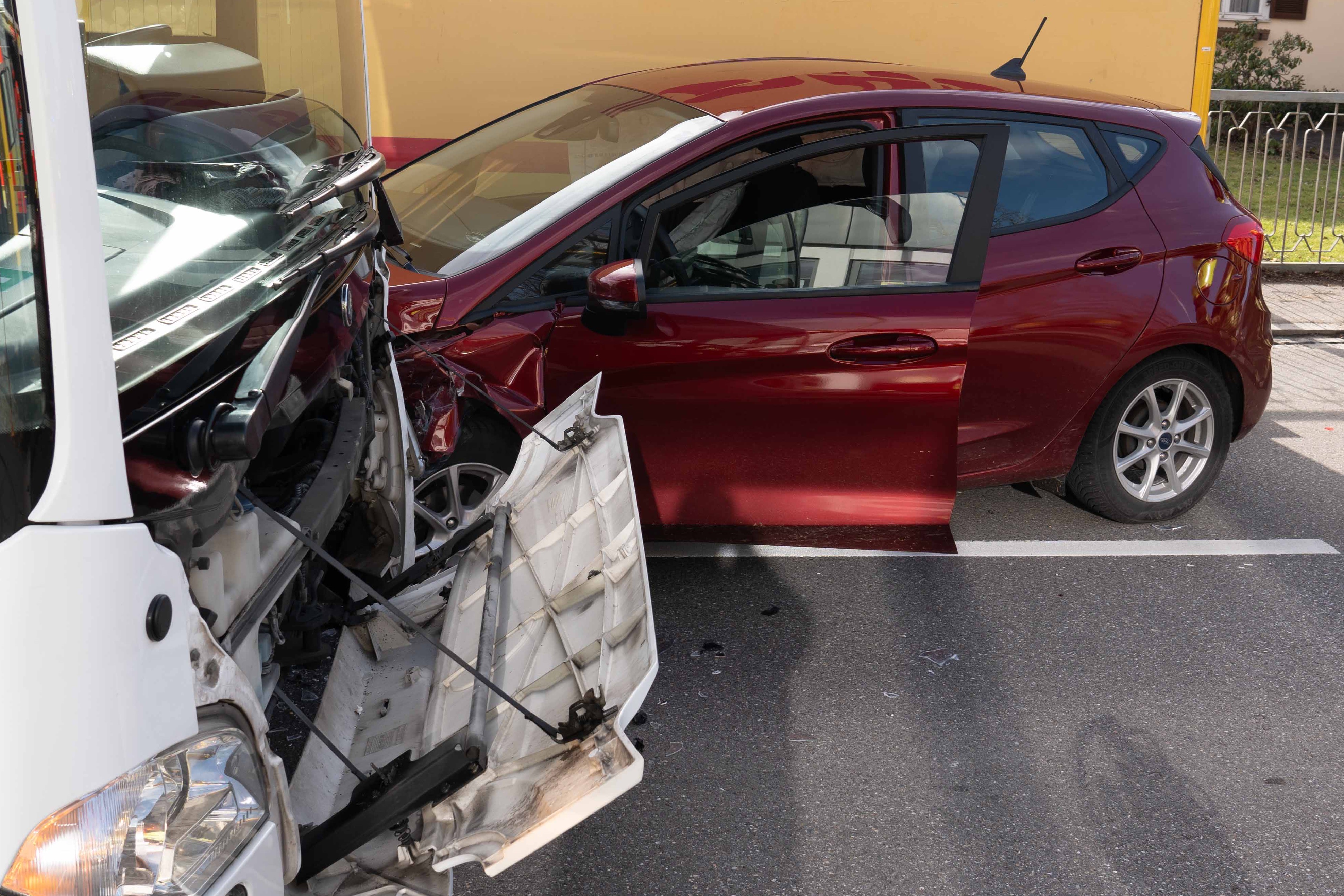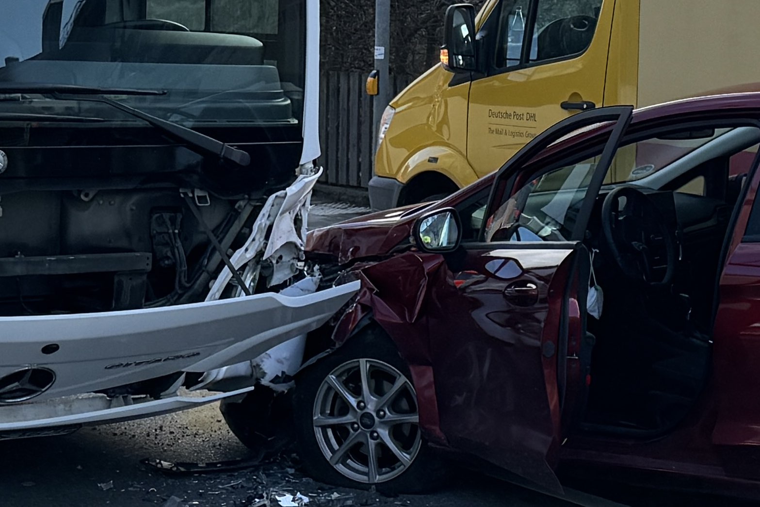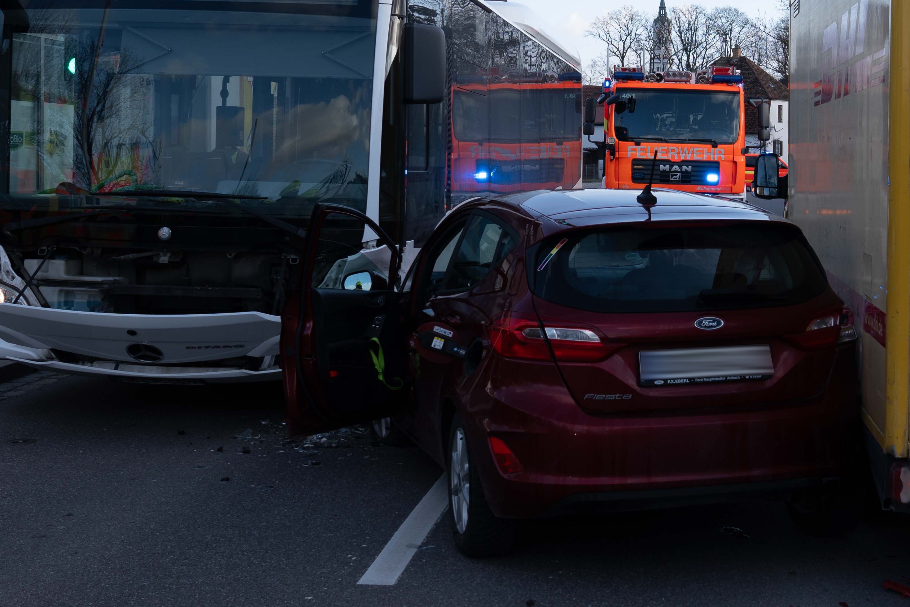 Infolge des Zusammenstoßes mit dem Bus sei der Pkw gegen die linke Seite des Kurier-Wagens gedrückt worden. Der 51-Jährige habe bei der Kollision eine Kopf-Verletzung erlitten. Er sei vom Rettungsdienst in ein Krankenhaus gebracht worden. Den an den drei Fahrzeugen entstandenen Sachschaden bezifferten Streifenbeamte von der örtlichen Polizeiinspektion auf insgesamt etwa 30 000 Euro. Auch die hiesige Feuerwehr war an der Unglücksstelle im Einsatz. Zum Unfall-Zeitpunkt befand sich laut Polizei nur der Fahrer selbst in dem Omnibus.