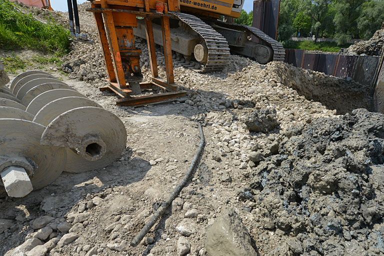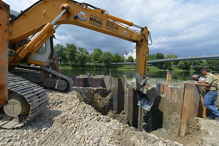 (ty) Entwarnung an der Donaubühne. Kurz nach 14.30 Uhr bargen Arbeiter an der Donaubühne in vier Meter Tiefe eine massive Eisenstange, die einige Konfusion hervorgerufen hatte. Beim Versuch, in der vergangenen Woche die Spundwand zu setzen, sind die Arbeiter auf etwas Metallisches in mehreren Meter Tiefe gestoßen. Etwa 1,5 Meter groß. Natürlich hätte es ebenso gut eine Fliegerbombe aus dem zweiten Weltkrieg sein können. Denn die ehemalige Gießerei am nördlichen Ufer war eines der Ziele amerikanischer Bombardements gewesen. Thomas Menke vom INKA-Planungsbüro hatte es indes von Anfang an für sehr unwahrscheinlich gehalten, dass es sich um einen Blindgänger handeln könnte. Dennoch musste man der Sache auf den Grund gehen. Und deshalb war heute bei den Grabungen auch der Kampfmittelräumdienst aus Abensberg an der Donaubühne, um in Ernstfall sofort die notwendigen Maßnahmen treffen zu können. Währen der Bagger sich vorsichtig Schaufel um Schaufel in die Tiefe arbeitete.