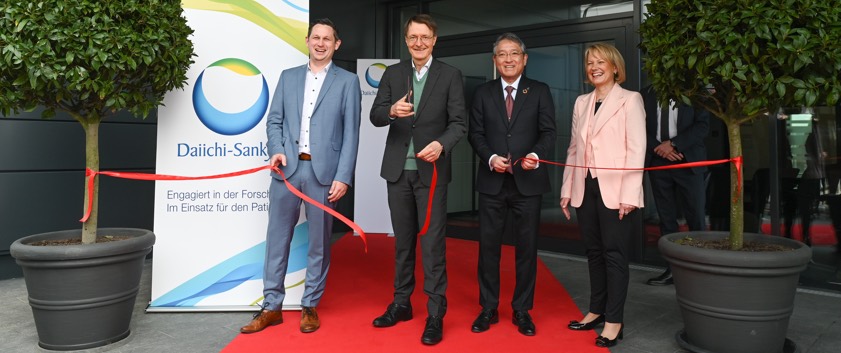 Matthias Kühn (Werksleiter von Daiichi-Sankyo in Pfaffenhofen), Bundesminister Karl Lauterbach (Masahiro Kato, Geschäftsführer von Daiichi-Sankyo-Europe) und Martina Witzel (Leiterin des Geschäfts-Bereichs Onkologie bei Daiichi-Sankyo in Deutschland) bei der Eröffnung des neuen Labor-Gebäudes im Werk in Pfaffenhofen.