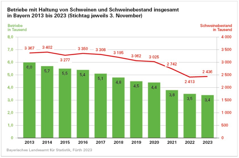 Im Durchschnitt hielt zum jüngsten Stichtag jeder Betrieb 720 Tiere, rund 22 mehr als im November des Vorjahres. Von den 3400 Betrieben hatten weniger als 900 Betriebe (26,2 Prozent) Schweine-Bestände von mehr als 1000 Tieren. In diesen Betrieben wurden mit 1 344 400 Schweinen weit über die Hälfte der bayerischen Bestände gehalten (55,2 Prozent). Der mit Abstand höchste Rückgang bei Betrieben zeigte sich bei jenen unter 100 Schweinen: minus 24,0 Prozent.