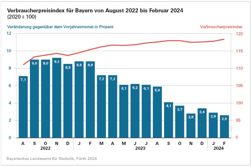 Im Vergleich zum Vormonat stiegen die Verbraucher-Preise in diesem Februar um 0,5 Prozent. Nahrungsmittel sind laut Landesamt für Statistik im Vergleich zum Januar dieses Jahres derzeit um 0,7 Prozent günstiger. Preise für Heizöl (plus 2,9 Prozent) und für Kraftstoffe (plus 1,1 Prozent) liegen hingegen über dem Wert des Vormonats. Für Speisen und Getränke in Restaurants, Cafés, Bars oder Ähnlichem müssen Verbraucherinnen und Verbraucher nun 0,9 Prozent mehr als noch im Januar bezahlen. Die Inflationsrate, gemessen als prozentuale Veränderung des Verbraucherpreis-Index gegenüber dem entsprechenden Vorjahres-Monat, liegt in diesem Februar – wie eingangs erwähnt – bei 2,6 Prozent.