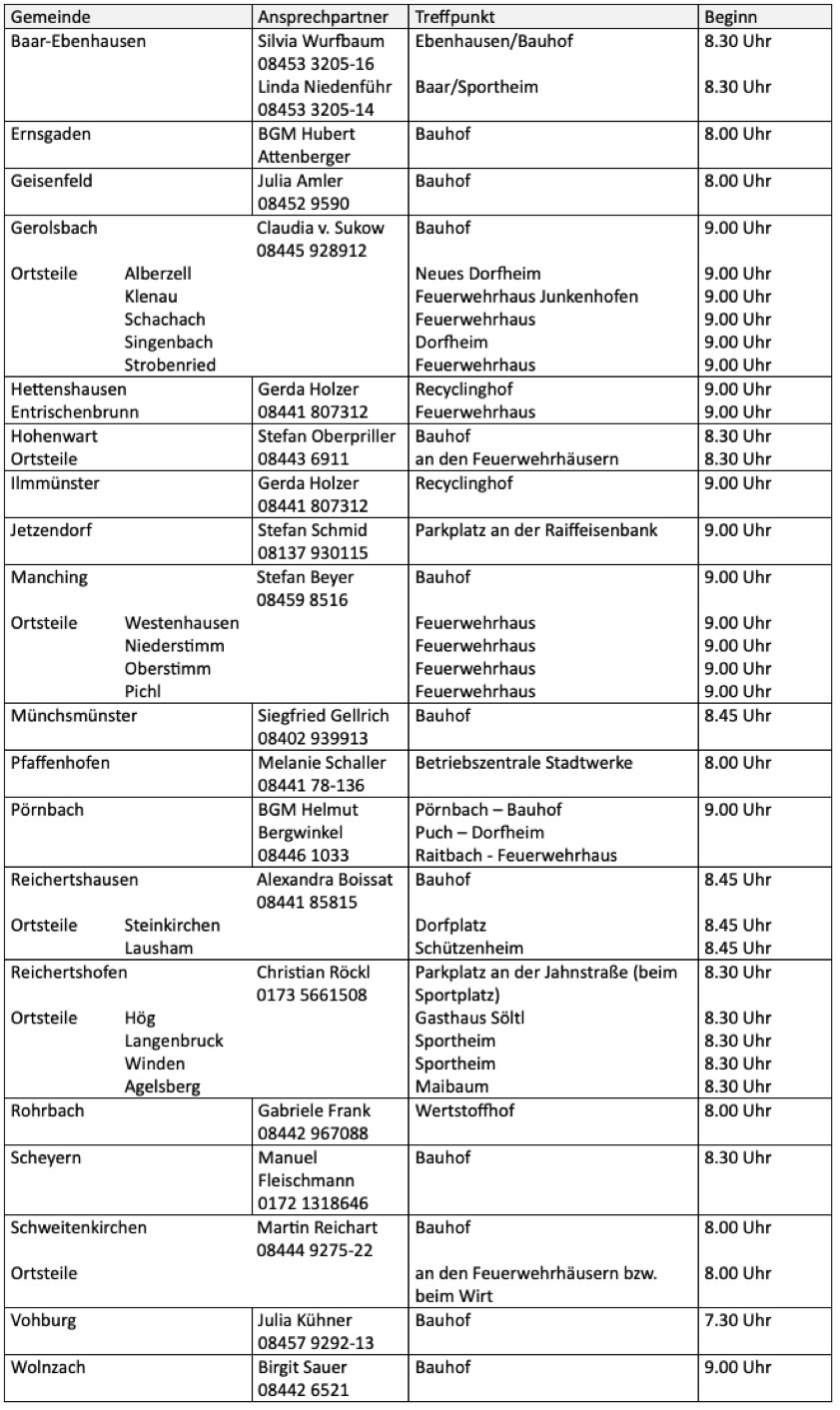 Hier die Treffpunkte, Startzeiten und Ansprech-Partner in den einzelnen Gemeinden im Überblick. Der AWP spendiert den Helfern eine Brotzeit.