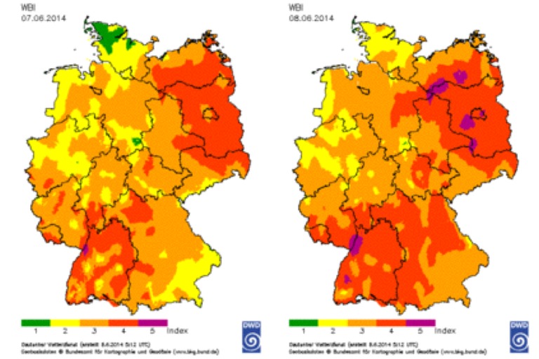 Die Übersicht des DWD zeigt, wie sich bereits von Samstag (links) auf Sonntag (rechts) die Waldbrandgefahr erhöht.