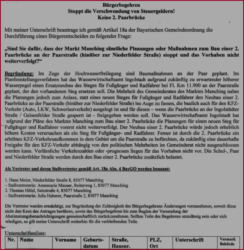 Von den am 6. März im Rahmen des Bürgerbegehrens "Stoppt die Verschwendung von Steuergeldern! Keine zweite Paar-Brücke" insgesamt 1099 eingereichten Unterschriften waren nach Auswertung der Gemeinde-Verwaltung letztlich 991 für gültig erklärt worden. Notwendig gewesen für die Zulässigkeit des Bürgerbegehrens gewesen wären nach Angaben aus dem Rathaus 876 gültige Unterschriften – das ergibt sich aus der Einwohnerzahl der Kommune.