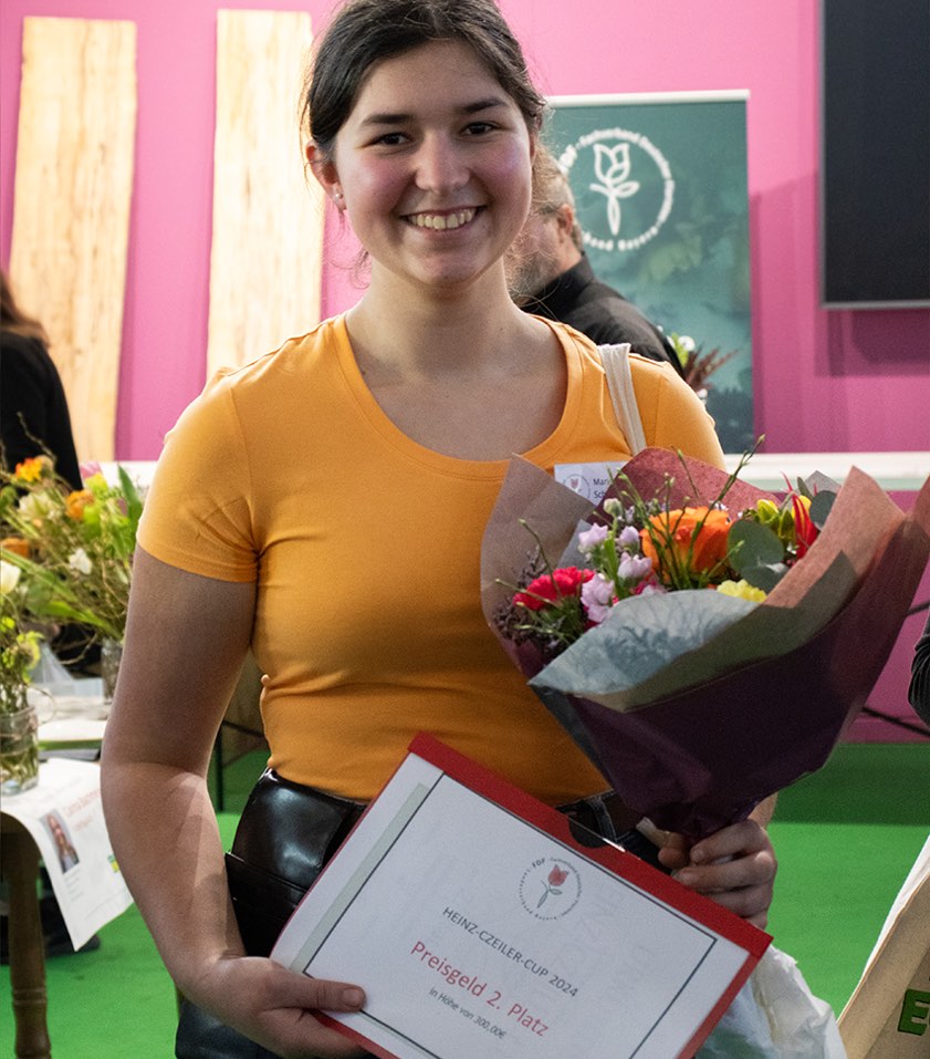 (ty) Marie Schäfer, die bei der Firma Fahn in Hohenwart im zweiten Lehrjahr ihrer Ausbildung zur Floristin steht, hat mit ihrer Leistung bei einem traditionellen Nachwuchs-Wettbewerb in der bayerischen Landeshauptstadt überzeugt. Beim "Heinz-Czeiler-Cup" errang die 17-Jährige aus dem Gemeinde-Bereich von Brunnen (Kreis Neuburg-Schrobenhausen) den zweiten Platz und durfte sich über ein Preisgeld in Höhe von 300 Euro freuen. Der kreative Wettstreit ist Bestandteil der Messe "Garten München" und wird vom hiesigen Bezirks-Verband im Fachverband deutscher Floristen ausgelobt. Benannt ist er nach dem Ehren-Präsidenten Heinz Czeiler.