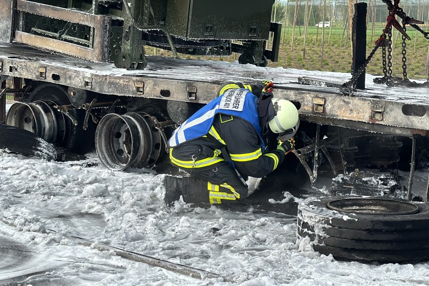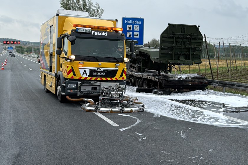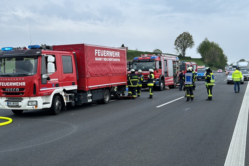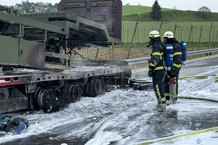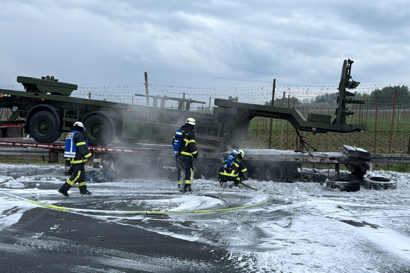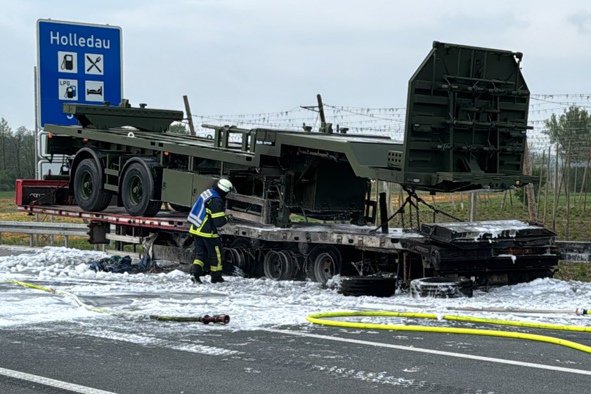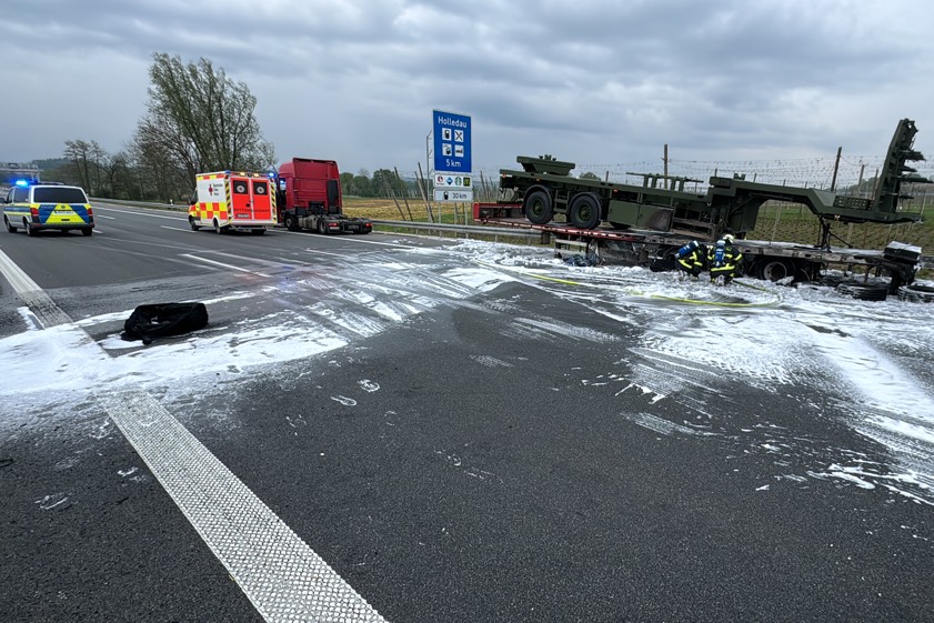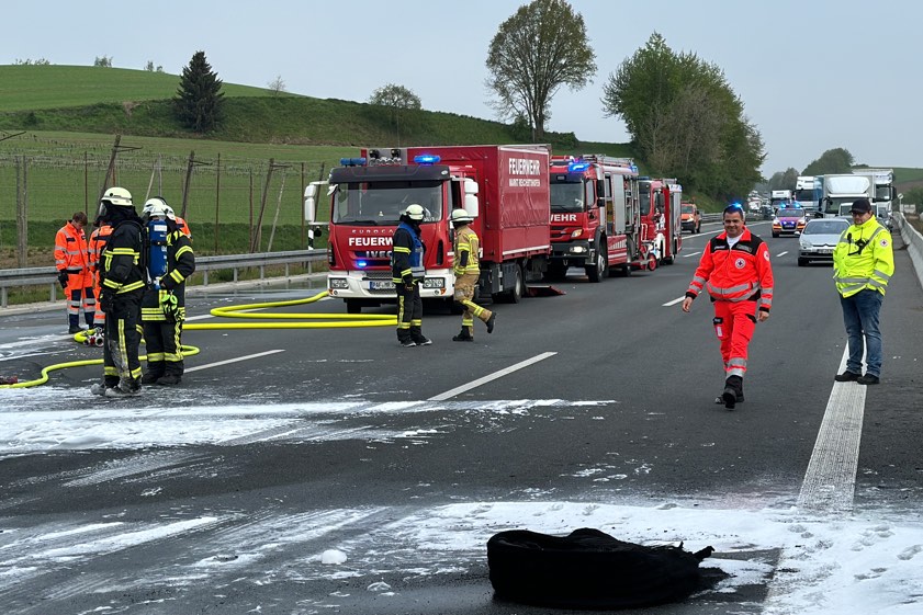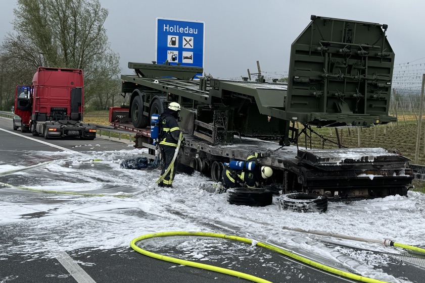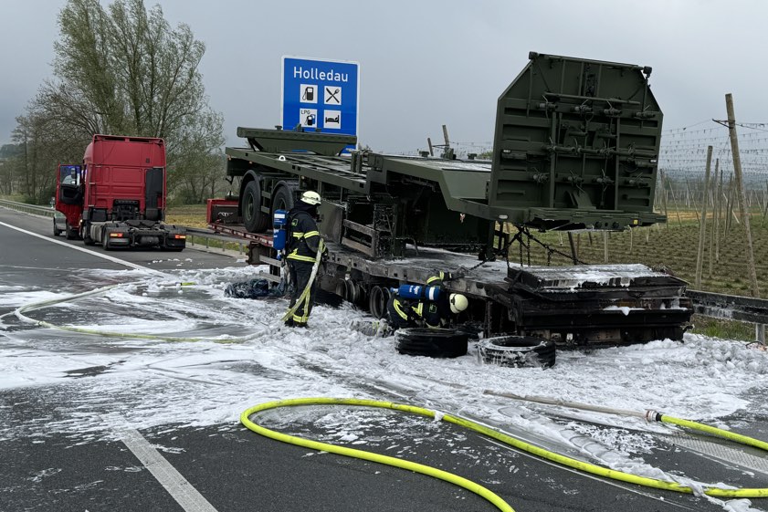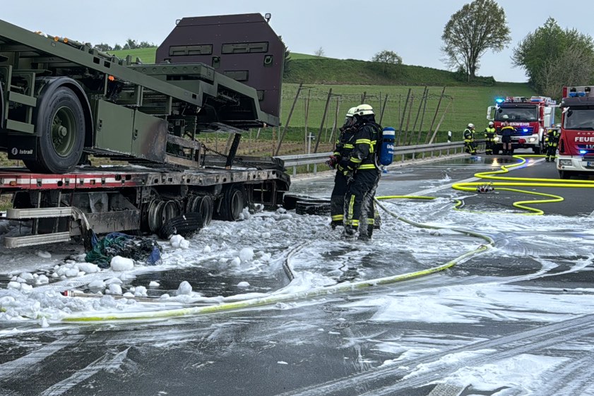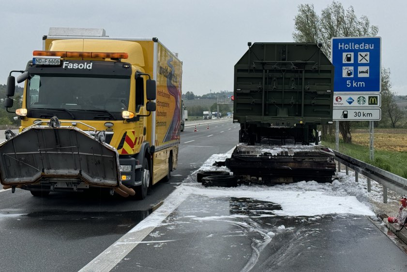 Er habe den Auflieger aber noch rechtzeitig abkoppeln und die Zugmaschine in Sicherheit bringen können. Der in Flammen geratene Auflieger sei durch den Brand vollständig beschädigt worden und habe letztlich abgeschleppt werden müssen. Transportier worden war auf dem Gespann ein Sattelauflieger der Bundeswehr; dieser wurde laut Polizei "ebenfalls in Mitleidenschaft gezogen". Durch die Lösch-Arbeiten sei zusätzlicher Wasserdampf entstanden, wodurch die Sicht auf der Gegenfahrbahn "massiv beeinträchtigt" gewesen sei. Aus diesem Grund habe die Autobahn in Richtung Nürnberg für zirka 30 Minuten gesperrt werden müssen.