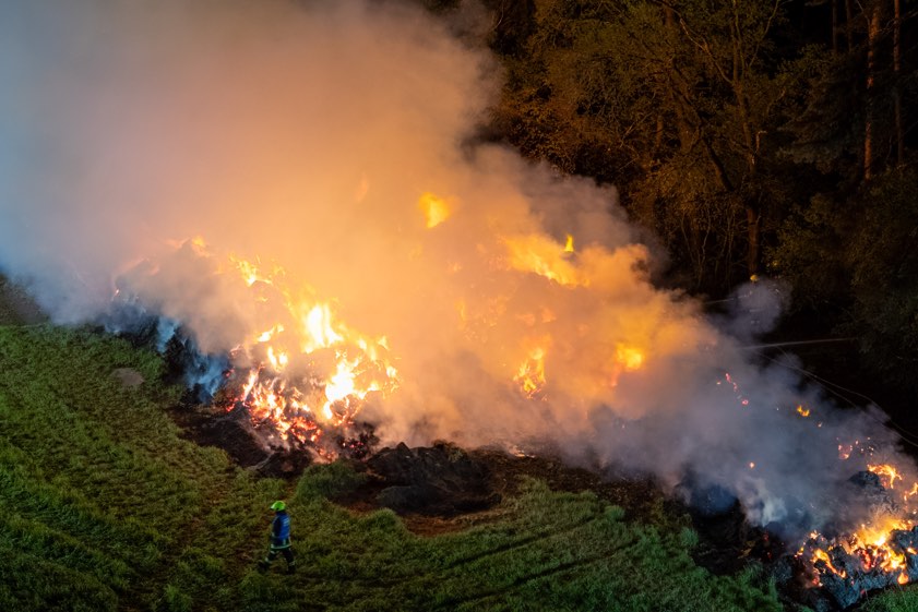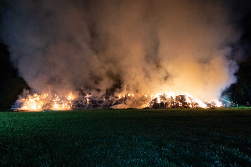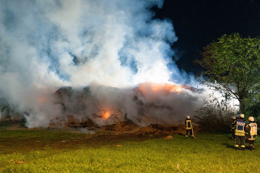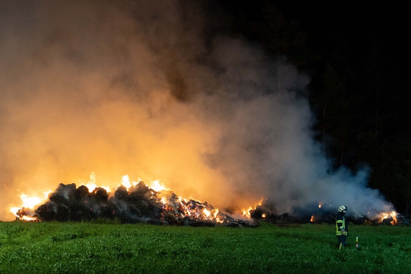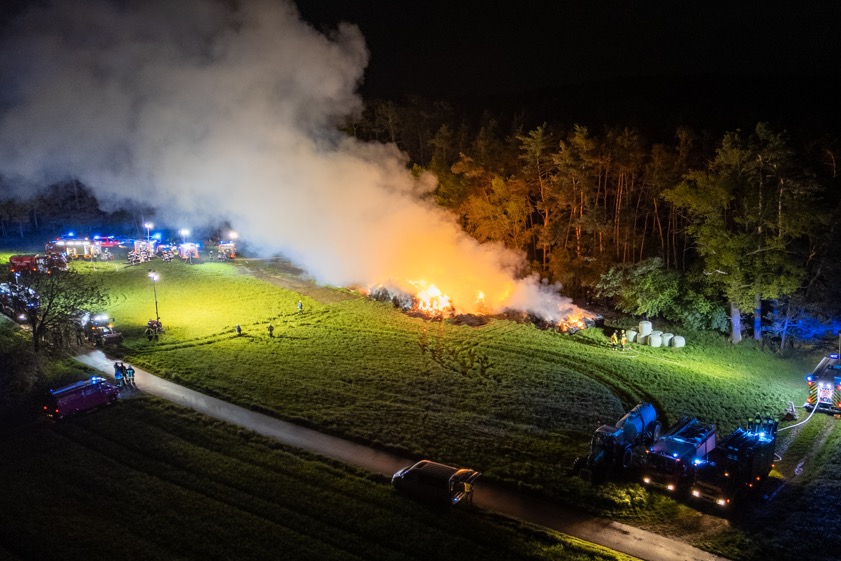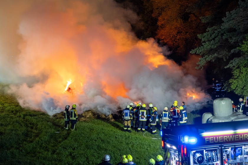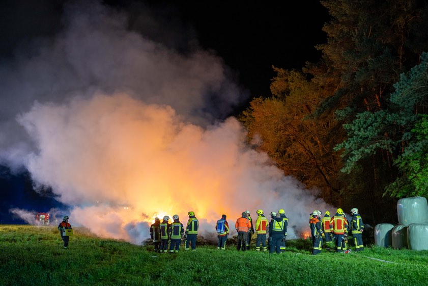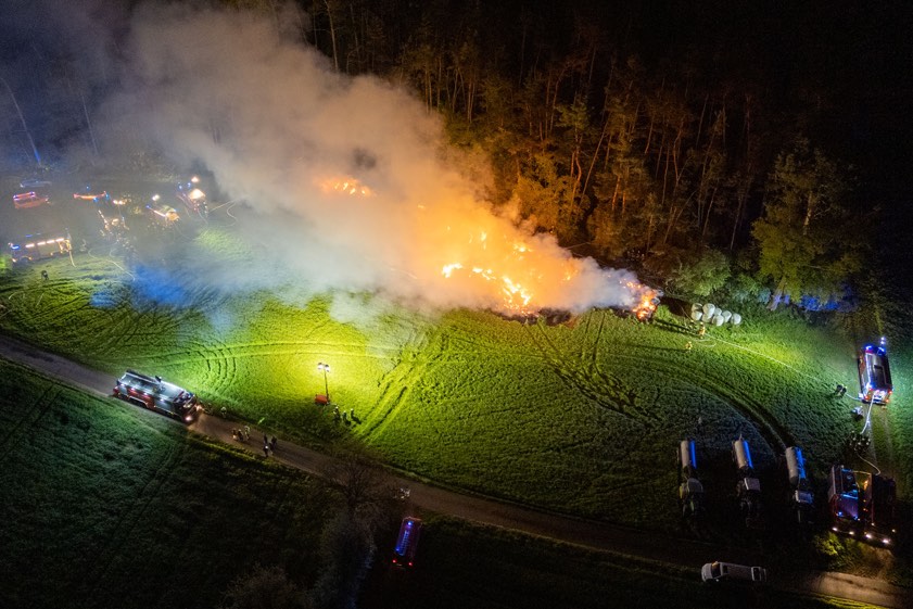 Gegen 0.15 Uhr seien in der Nähe des Weilers Wintersoln im Gemeinde-Bereich von Karlskron zirka 600 brennende Strohballen festgestellt worden. Erneut wurden zahlreiche Floriansjünger alarmiert. "Die im Freien abgelegten, folierten Rundballen wurden nach ersten Erkenntnissen mutwillig in Brand gesteckt", heißt es aus dem Polizeipräsidium Oberbayern-Nord. Hier belaufe sich der entstandene Sachschaden nach bisherigen Erkenntnissen auf etwa 20 000 Euro. Verletzt worden sei auch durch diese Feuersbrunst niemand. Nachfolgend sehen Sie Bilder von diesem Lösch-Einsatz.