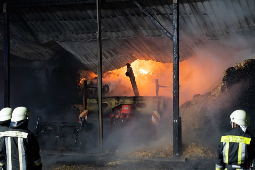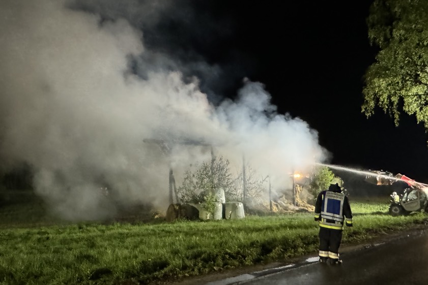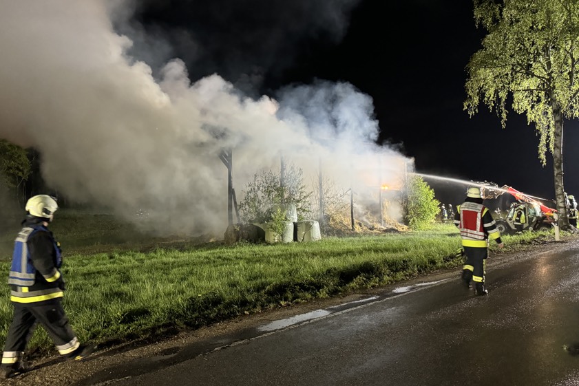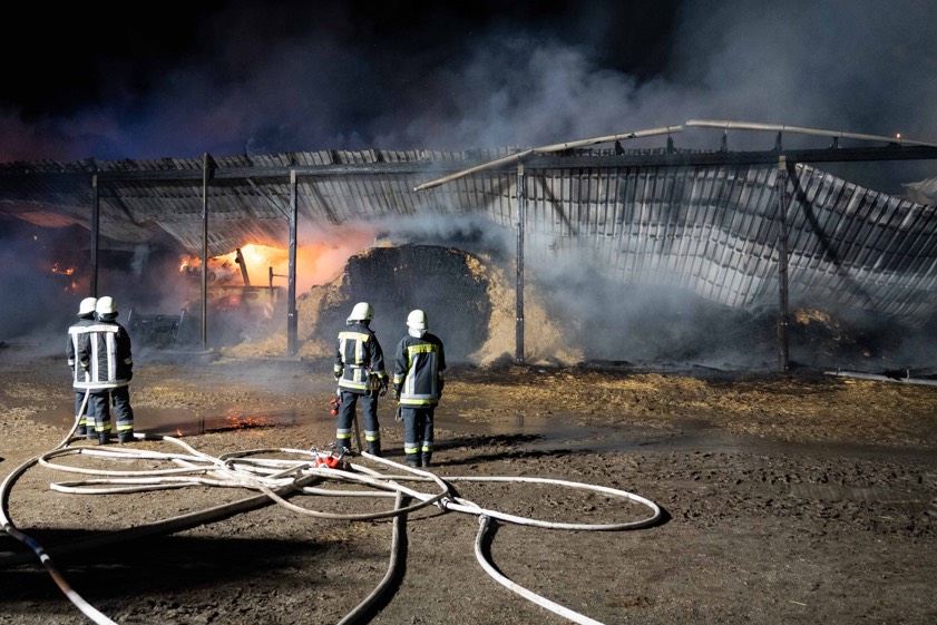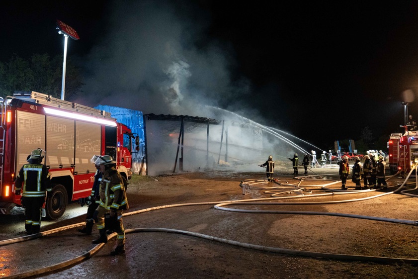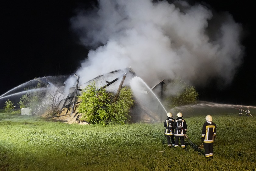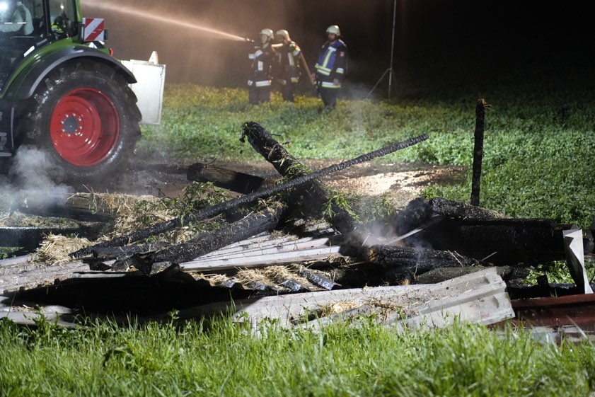 Gegen 2.45 Uhr wurde ein weiterer Brand bei der Polizei gemeldet. Betroffen war laut Polizei eine Feldscheune am Weiler Beuern im Gemeinde-Bereich von Hohenwart. "Auch hier hatten offenbar Brandstifter absichtlich Feuer gelegt", meldet das Polizeipräsidium Oberbayern-Nord. "In der Halle befanden sich neben etwa 500 Strohballen mehrere landwirtschaftliche Fahrzeuge", heißt es weiter. Die Lösch-Arbeiten dauerten nach den Worten des Polizei-Sprechers bis in die Morgenstunden an. Der Sachschaden liege allein hier im sechsstelligen Euro-Bereich. Verletzt worden sei auch hier niemand. Nachfolgend sehen Sie Bilder von diesem Lösch-Einsatz.