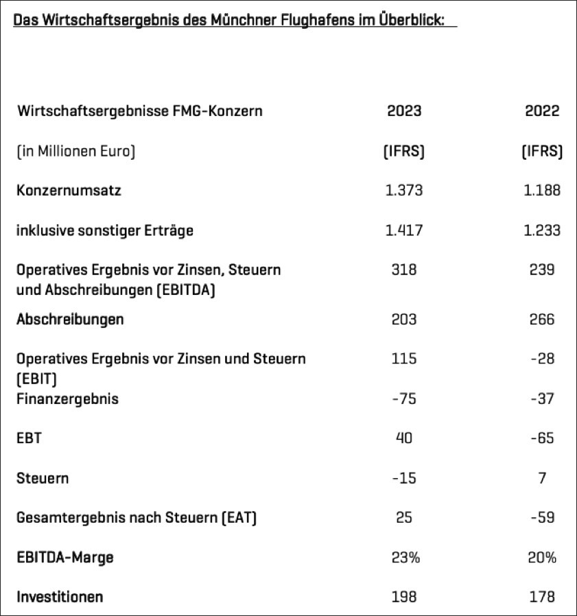 (ty) Angesichts eines deutlichen Wachstums bei den Passagier-Zahlen von 17 Prozent hat die Flughafen-München-GmbH (FMG) nach eigenem Bekunden erstmals seit der Corona-Pandemie wieder ein positives Jahres-Ergebnis von 25 Millionen Euro verzeichnet. Die Umsatz-Erlöse stiegen auf rund 1,4 Milliarden Euro. Auch das operative Ergebnis vor Zinsen und Steuern fiel erstmals seit 2019 mit 115 Millionen Euro wieder positiv aus. Mit einem Passagier-Aufkommen von über 37 Millionen – 5,4 Millionen mehr als im Vorjahr – erreichte der Airport rund 80 Prozent des Vor-Krisen-Niveaus. Die Zahl der Starts und Landungen stieg auf 302 000 Flugbewegungen beziehungsweise um sechs Prozent. Die Auslastung der Flugzeuge erreichte mit 81 Prozent ein neues Rekord-Niveau.