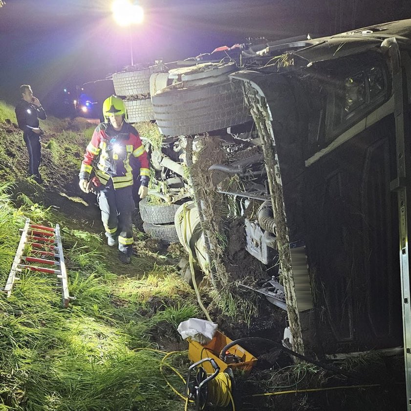 27-Jähriger verlor bei Siegenburg die Kontrolle über sein Gespann, das schließlich umkippte. Diesel musste abgepumpt werden. Aufwändige Bergung.