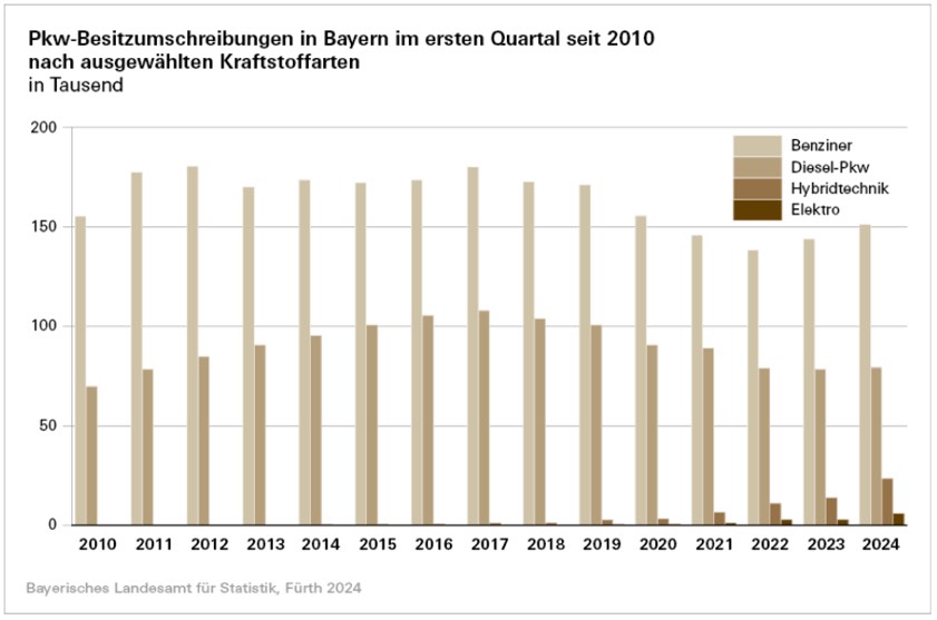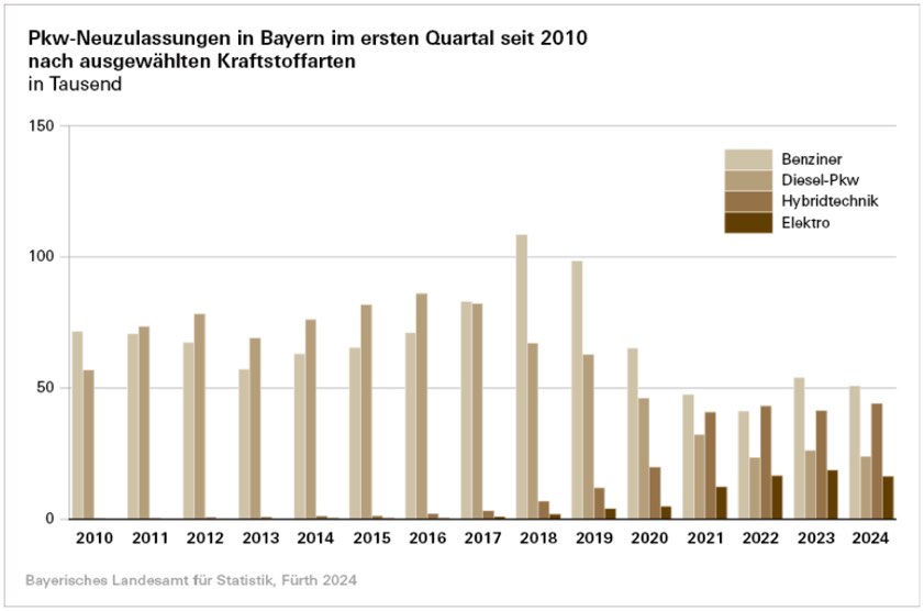 (ty) Die Zahl der neu zugelassenen Kraftfahrzeuge (Kfz) hat nach einer aktuellen Auswertung der Statistik des Kraftfahrt-Bundesamts im ersten Quartal dieses Jahres in Bayern bei 170 902 Kfz gelegen. Das waren 2,1 Prozent weniger als im ersten Quartal des vergangenen Jahres. Wie das bayerische Landesamt für Statistik weiter mitteilt, verringerte sich die Zulassungs-Zahl bei Personenkraftwagen (Pkw) um 3,7 Prozent auf 136 094. Bei den Neuanmeldungen von Benzinern steht ein Minus um 5,9 Prozent auf 50 993, bei Diesel-Pkw ein Rückgang um 8,3 Prozent auf 24 039 Pkw.
