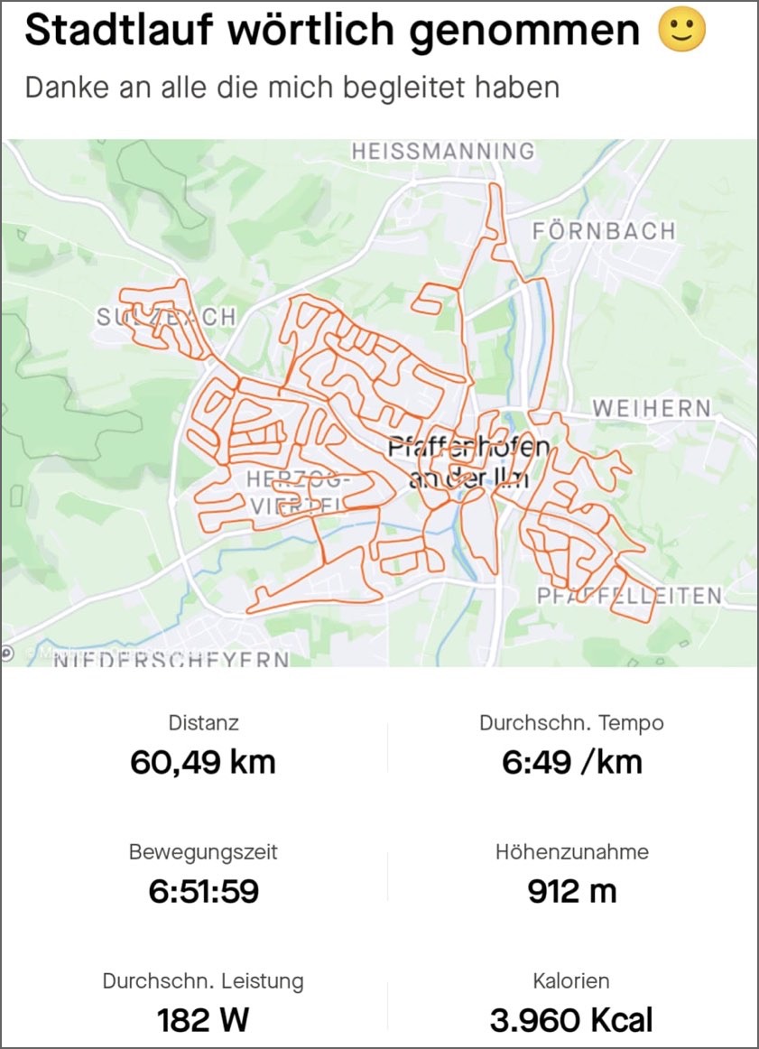(ty) Geschafft! Nach rund acht Stunden hatte der Extrem-Läufer Christian Schuster am heutigen Samstag gegen 17.30 Uhr sein ambitioniertes Ziel erreicht: Er durchquerte das Stadt-Gebiet von Pfaffenhofen und ließ dabei kaum eine Straße aus, so dass am Ende, wie geplant, eine Distanz von gut 60 Kilometern heraussprang. Bei idealen äußeren Bedingungen absolvierte der 38-jährige Ausdauer-Athlet diese Herausforderung "ziemlich entspannt und mit vielen positiven Gefühlen", wie er danach im Gespräch mit unserer Zeitung erzählte.