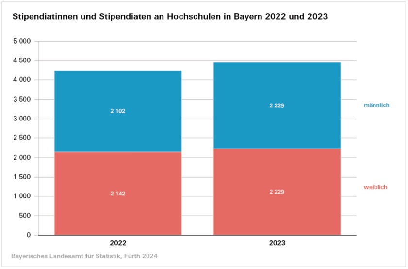 Zwei Drittel (2943 Personen oder 66,0 Prozent) der je zur Hälfte vom Bund und privaten Mittelgebern (zum Beispiel Unternehmen, Stiftungen oder private Spenden) finanzierten Stipendien von monatlich 300 Euro erhielten im vergangenen Jahr in Bayern Studierende an Universitäten und mit 27,9 Prozent insgesamt 1 243 Studierende an Fachhochschulen. Die Hälfte der Deutschland-Stipendien (50,0 Prozent) wurde an Studentinnen vergeben. Der entsprechende Anteil lag an Fachhochschulen mit 51,5 Prozent etwas über dem an den Universitäten (48,0 Prozent).
