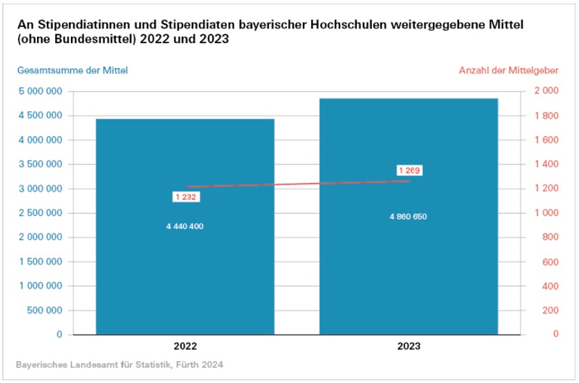 An Studierende in so genannten Mint-Fächern (Mathematik, Ingenieur-Wissenschaften, Natur-Wissenschaften, Technik) gingen 52,7 Prozent oder 2348 aller Stipendien. Die fünf am häufigsten geförderten Studien-Bereiche waren Wirtschafts-Wissenschaften (703), Informatik (624), Maschinenbau / Verfahrenstechnik (433), Elektro-Technik und Informations-Technik (219) sowie Musik / Musikwissenschaft (194). Für das Jahr 2023 betrug im Freistaat die Gesamtsumme der an die Stipendiaten weitergegebenen Mittel (ohne Bundesmittel) 4,9 Millionen Euro (Vorjahr: 4,4 Millionen Euro). Die Zahl der privaten Mittelgeber stieg um 37 auf 1269.