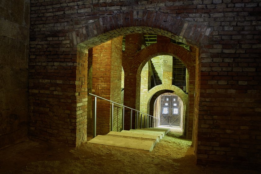 Während der zentrale Stützpfeiler aus Kalkstein besteht, wurden Ziegel für das umliegende Mauerwerk verwendet. Aus Ziegelsteinen ist auch die Kuppel gemauert, die einen Durchmesser von 29 Metern und eine lichte Höhe von 14 Metern aufweist. Darüber erhebt sich ein eiserner Dachstuhl, der sich ohne Kontakt mit der Kuppel selbst trägt. Die beiden Fotografinnen der bayerischen Schlösser-Verwaltung haben sich jedoch nicht nur auf die Dokumentation von Architektur beschränkt. Es geht ihnen auch um das Einfangen von Stimmungen und um atmosphärisches Licht. Insofern sind die Fotografien auch selbst zu Kunstwerken geworden.