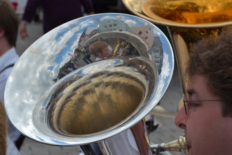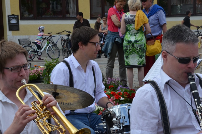 Und den Leuten, die sich um die Mittagszeit in der City herumtrieben, gefiel es auch, was die Musiker da zu Gehör brachten. Viele blieben spontan stehen, sangen und klatschten mit, oder versuchten noch einen Platz im Café zu ergattern, um bei dieser Unterhaltung eine Pause einzulegen. Möglicherweise gibt's heute Abend noch eine Zugabe von den Polkabuben – auf dem Weinfest. Sommer in der Stadt eben. Lesen Sie dazu auch: Lebendige Zielflaggen