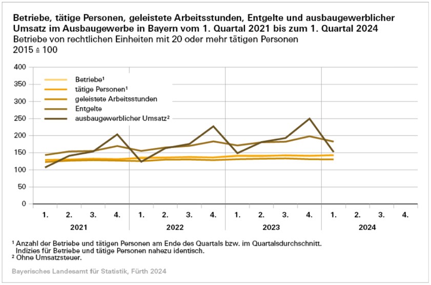 Nach regionaler Betrachtung auf Ebene der Regierungsbezirke entfiel gut ein Drittel des Umsatzes auf die Firmen mit Sitz in Oberbayern. Die 667 dort ansässigen Ausbau-Gewerbe-Betriebe erzielten mit 1,06 Milliarden Euro ein durchschnittliches Plus von nominal 7,1 Prozent gegenüber dem ersten Quartal 2023. Die Betriebe in Unterfranken erwirtschafteten im Mittel nominale Umsätze um 11,8 Prozent unter dem Niveau des Vorjahres-Zeitraums. Die in Niederbayern, der Oberpfalz, Oberfranken, Mittelfranken oder Schwaben angesiedelten Betriebe verzeichneten durchschnittliche Umsatz-Veränderungen zwischen nominal minus 8,8 Prozent und plus 12,6 Prozent.
