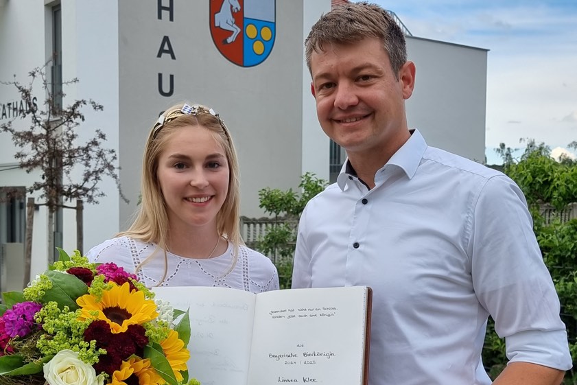 (ty) Ein majestätisches Heimspiel ist das sozusagen gewesen für Linnea Klee. Die, wie berichtet, kürzlich zur bayerischen Bierkönigin 2024/25 gewählte junge Frau ist zu Besuch im Rathaus von Jetzendorf gewesen. Klee stammt aus dem Ortsteil Volkersdorf. Empfangen wurde sie vom amtierenden Bürgermeister Tobias Endres (Foto oben). Er gratulierte der neuen Repräsentantin des bayerischen Volksgetränks und überreichte ihr auch einen Blumenstrauß. Nachdem sich Linnea Klee ins "Goldene Buch" der Gemeinde eingetragen hatte, wünschte ihr Endres im Namen der Kommune viel Kraft und Glück für ihre vielseitigen Aufgaben als Bierkönigin. Zum Hintergrund: Linnea Klee aus Jetzendorf ist die neue bayerische Bierkönigin