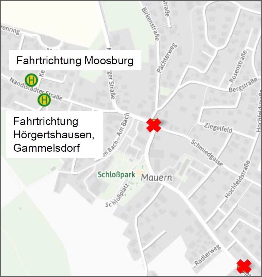 Die Linie 683 halte zusätzlich in Wollersdorf bei schulzeitrelevanten Fahrten, da die Linien 682 und 682V dort nicht halten könnten. Fahrgästen aus Niederndorf, Pfettrach (Abzweigung Wang) und Zieglberg empfhele der MVV, die benachbarten Haltestellen zu nutzen – entweder den Ersatz-Halt in Mauern oder die Haltestelle Wittibsmühle-Abzweigung. Die Grafik zeigt den Standort der Ersatz-Haltestellen (gelb-grüne Logos) in der Nandlstädter Straße sowie die beiden vorübergehend nicht anfahrbaren Haltestellen in Mauern (rote Kreuze).