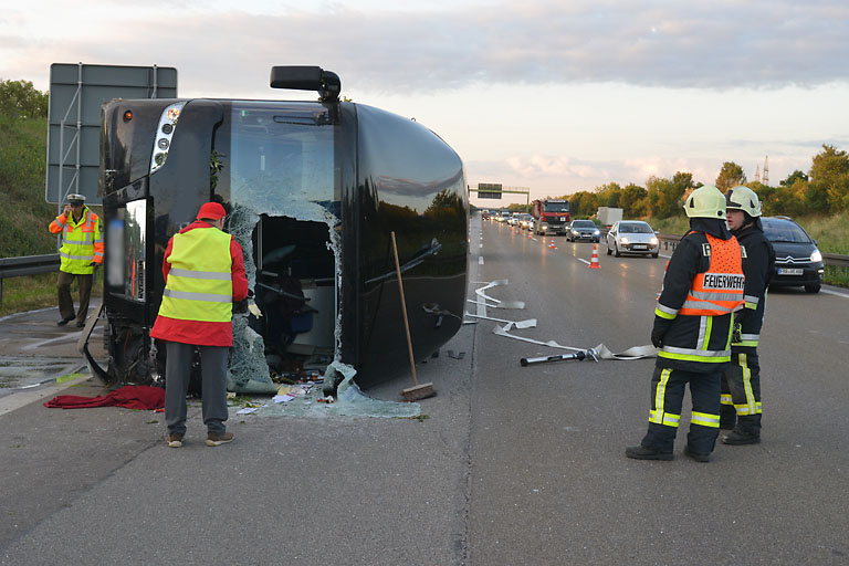 (ty) Ein spektakulärerer Unfall ereignete sich heute früh gegen 4.30 Uhr auf der Autobahn Richtung Nürnberg. Kurz vor der Abschlussstelle Ingolstadt Süd war ein Reisebus mit einer 21-köpfigen Gruppe Buddhisten aus Berlin umgekippt. Ein unglaublicher Glücksfall, dass es bei diesem Unfall nur Leichtverletzte gab. Nach bisherigen Erkenntnissen gab es zwölf Verletzte, die zum Teil ins Klinikum Ingolstadt gebracht wurden. Auch einer der Busfahrer ist verletzt, nicht aber der, der zum Unfallzeitpunkt am Steuer saß.
