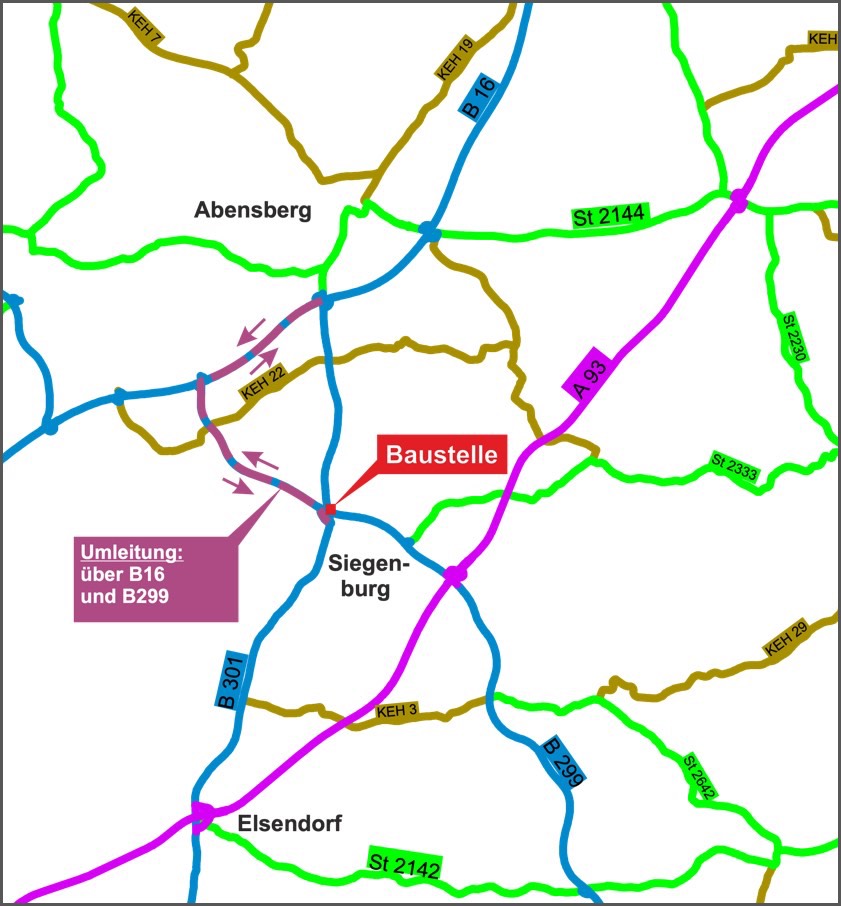 "Der allgemeine Bauwerks-Zustand und die derzeitige Tragfähigkeit der Brücke machen diese Maßnahme notwendig", fasst das staatliche Bauamt aus Landshut zusammen. "Ab Dienstag wird die Brücke grundhaft instandgesetzt und auch der Überbau des Bauwerks erneuert." Ziel sei es, "die Brücke der Bundesstraßen-Kreuzung für künftige Lasteinwirkungen fit zu machen". Die oben verlaufende B301 werde im Baustellen-Bereich für die Instandsetzung über die ganze Bauzeit voll gesperrt. Die Umleitungs-Strecke führe – von Abensberg kommend – über die B16 und die B299 zurück auf die B301 (siehe Karten unten). In Gegenrichtung, also von Siegenburg beziehungsweise Elsendorf, kommend gelte die Umleitung analog.